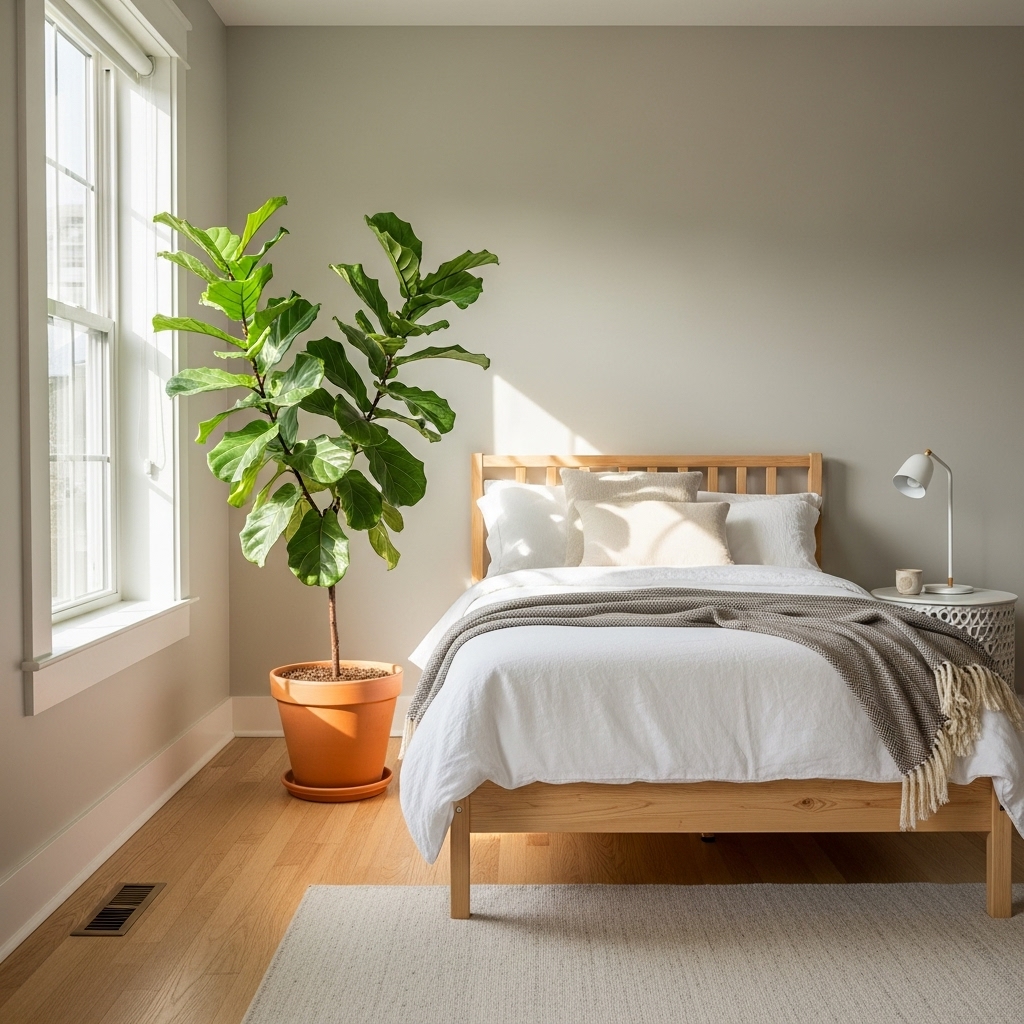 A single potted plant or a vase of fresh greenery can bring life into your bedroom. Plants purify the air, promote relaxation, and add an organic touch that softens the clean lines of minimalist design.