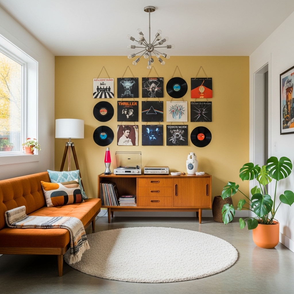Music lovers can turn favorite album covers or records into stylish wall art using simple frames or adhesive mounts.