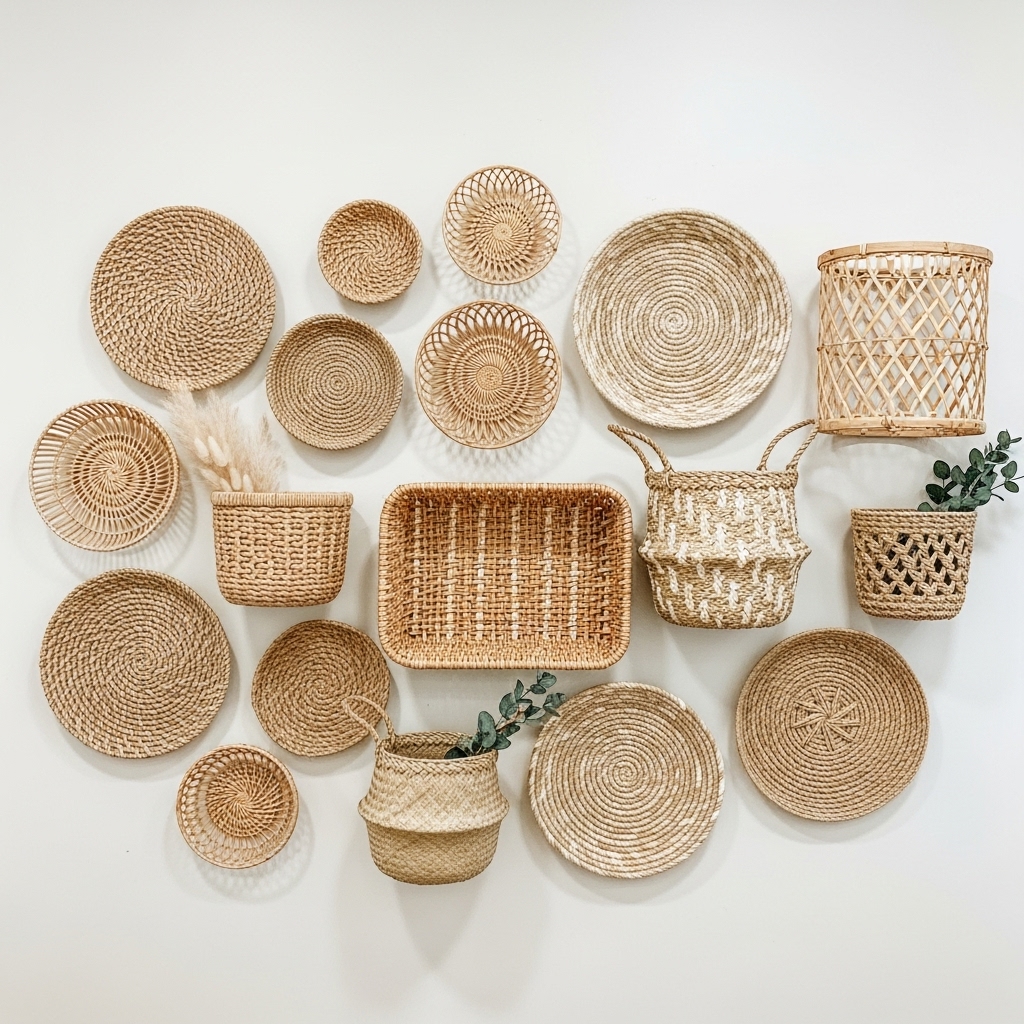 Arrange decorative baskets of different sizes and patterns for a boho wall accent that adds depth and charm.
