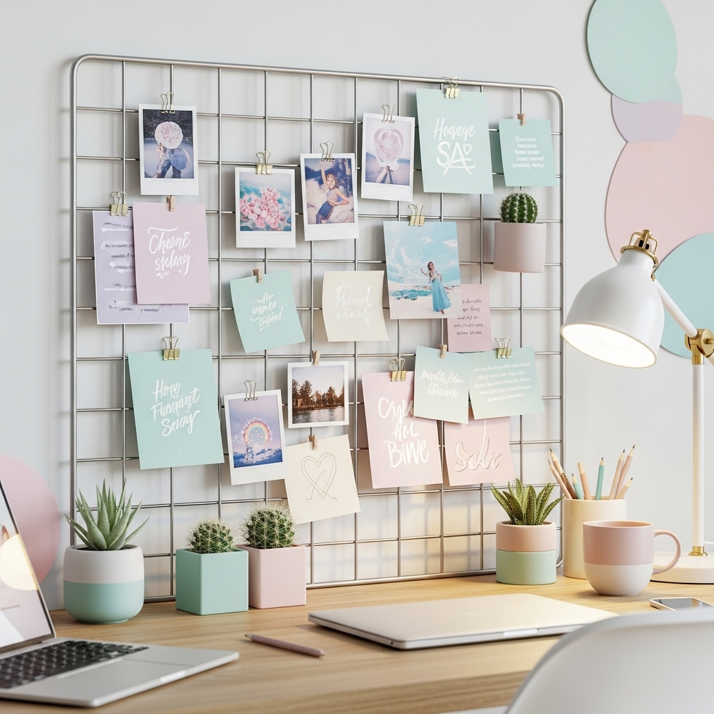 Use a wire grid panel to hang notes, mini plants, or polaroids. It’s perfect for a workspace or dorm room.
