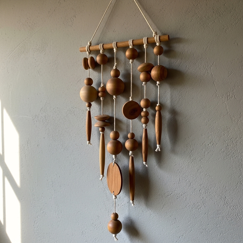 Use wooden beads, string, and driftwood to create a charming beaded wall accent that complements neutral decor.