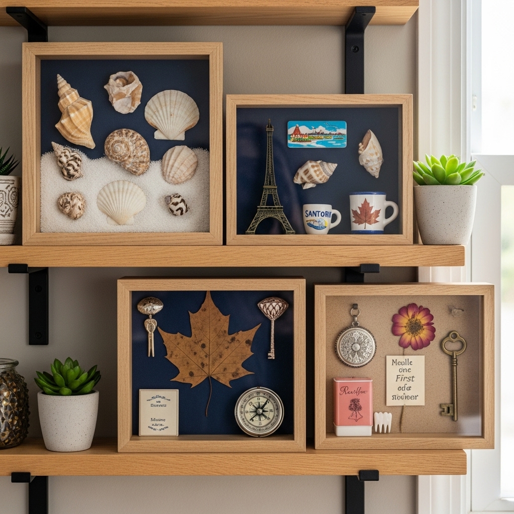 Showcase memorabilia — seashells, souvenirs, or family heirlooms — in custom shadow boxes.