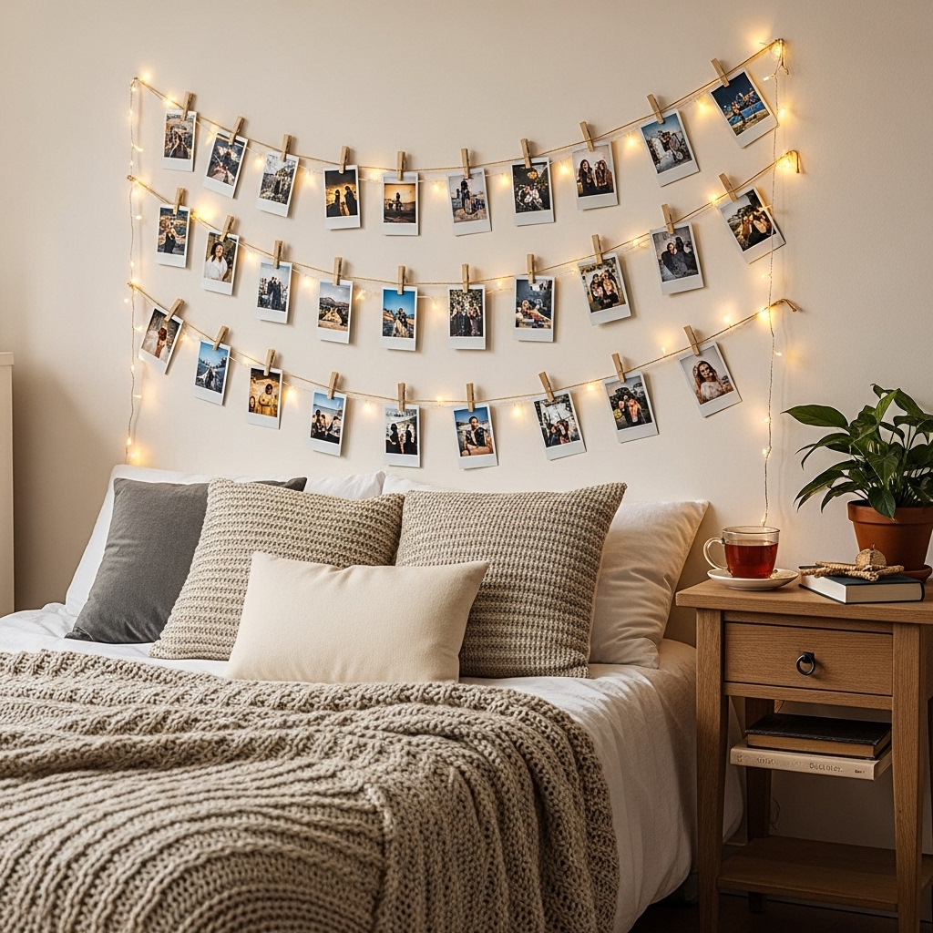 Skip traditional frames and use twine, clips, and fairy lights to hang your favorite pictures creatively.
