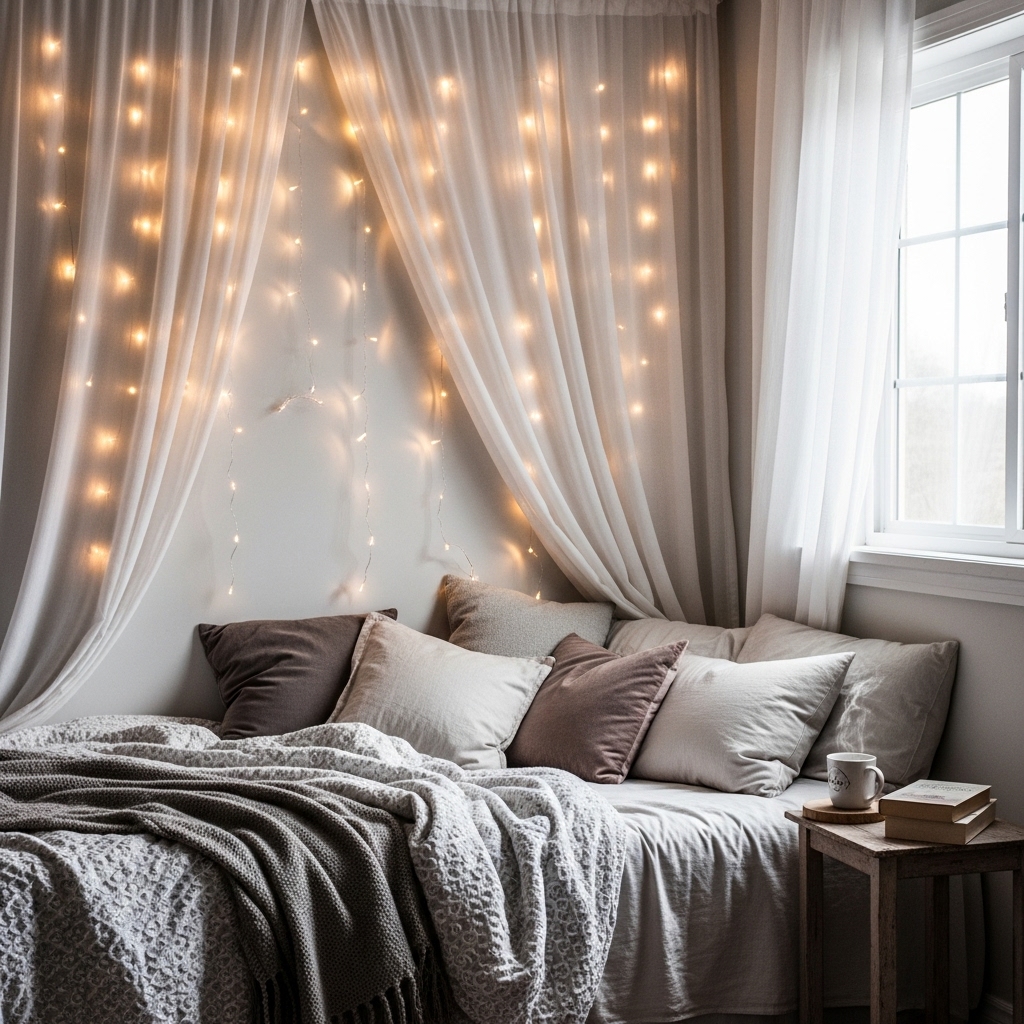 Hang twinkle lights behind sheer curtains or arrange them into shapes for a cozy, dreamy vibe.