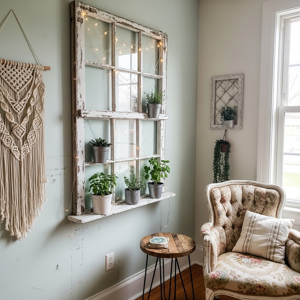Repurpose old window frames by adding photos, dried flowers, or fairy lights inside the panes.