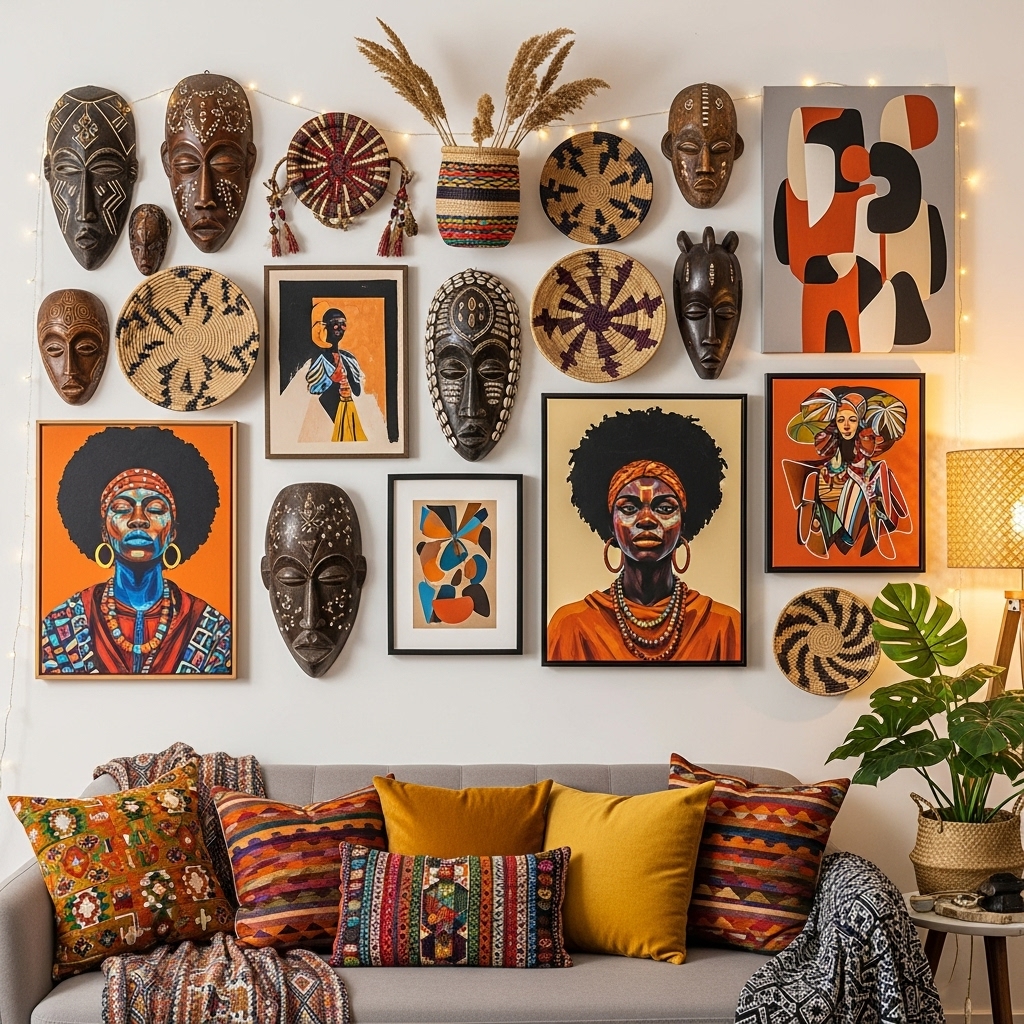 Walls are the perfect canvas for storytelling in Afrohemian homes. Instead of sterile art, consider handcrafted and cultural pieces: