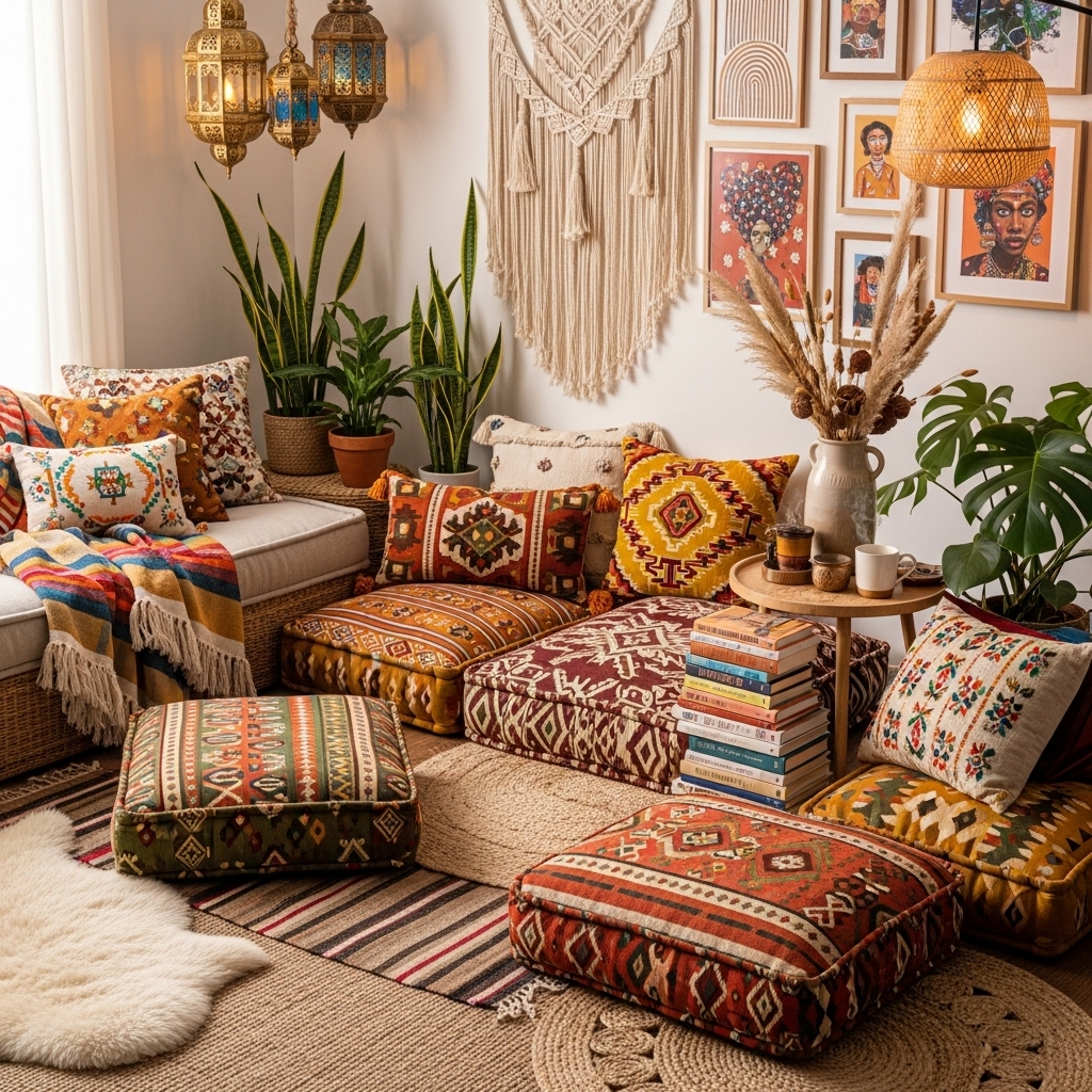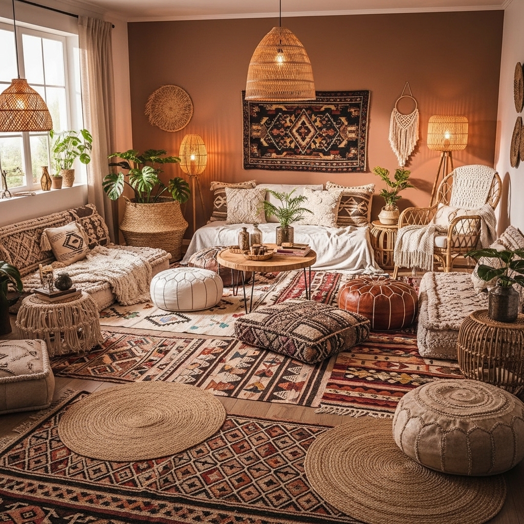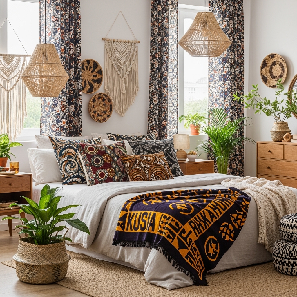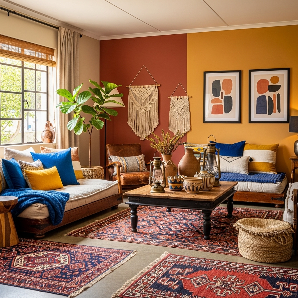 - Living Room: Layer patterned pillows, add a statement rug, and display woven wall art.
