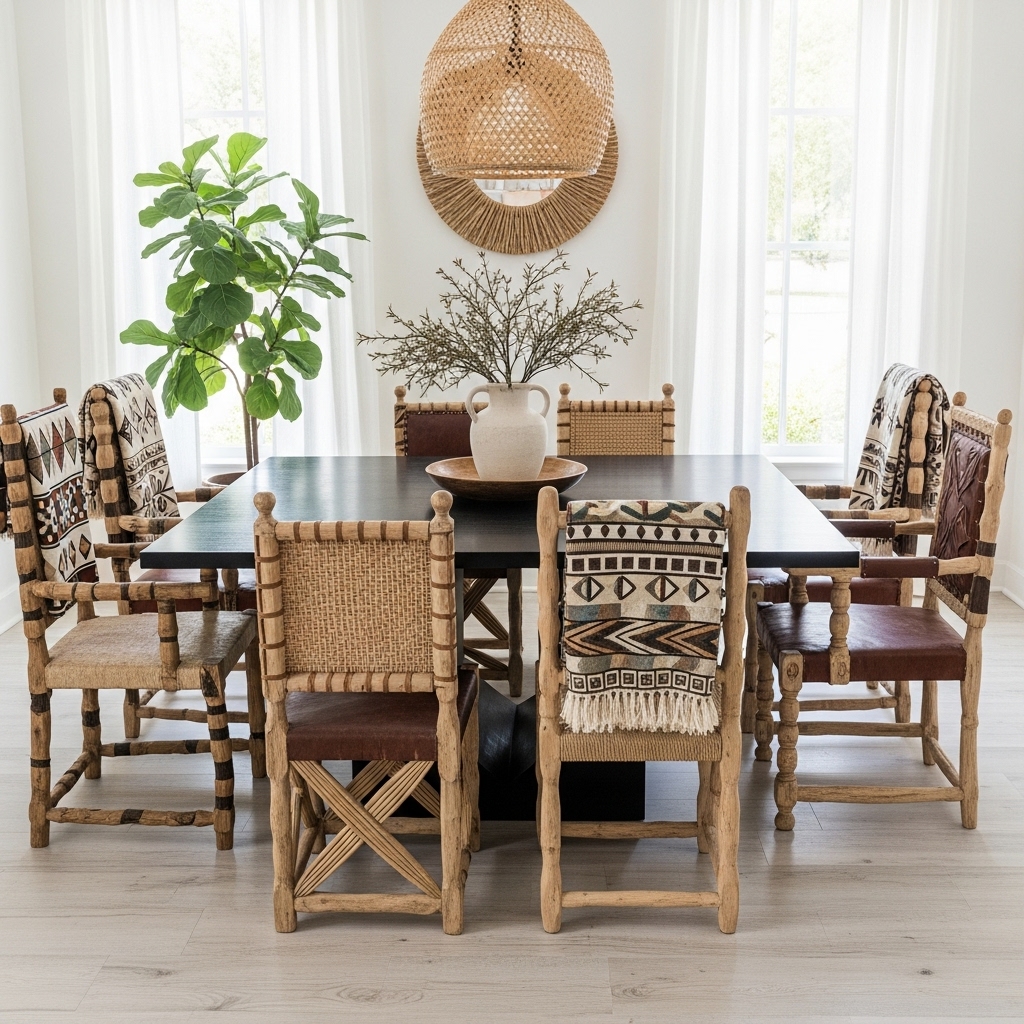 - Dining Room: Pair a rustic wooden table with mismatched chairs and woven placemats.