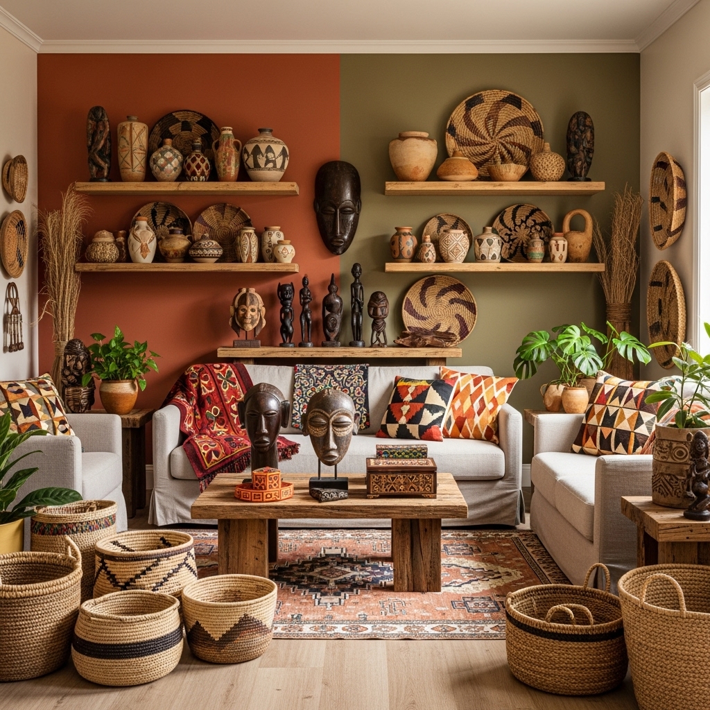 - Bedroom: Use African print bedding, warm earthy tones, and a few plants for serenity.