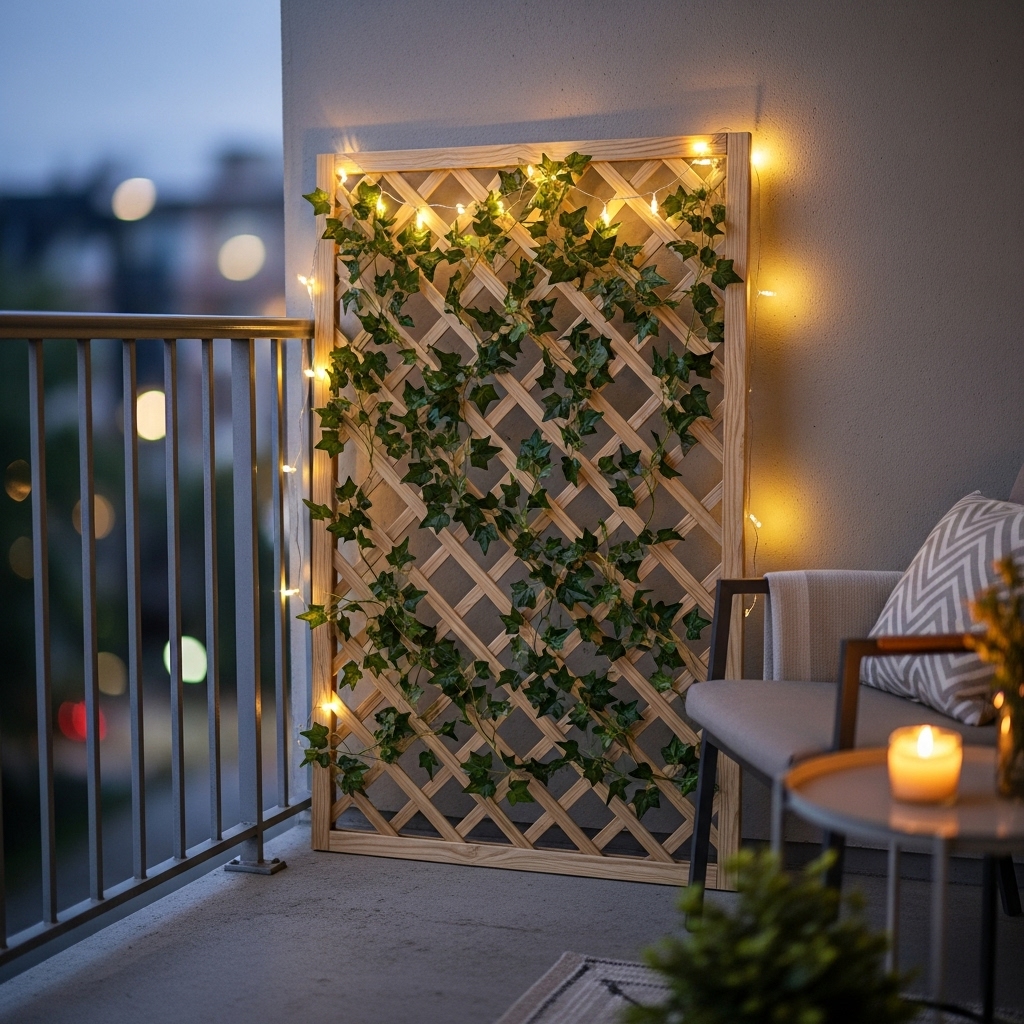Lightweight lattice panels made from PVC or wood-look materials can be leaned against walls or railings and secured with zip ties. They provide partial coverage while still letting light through.