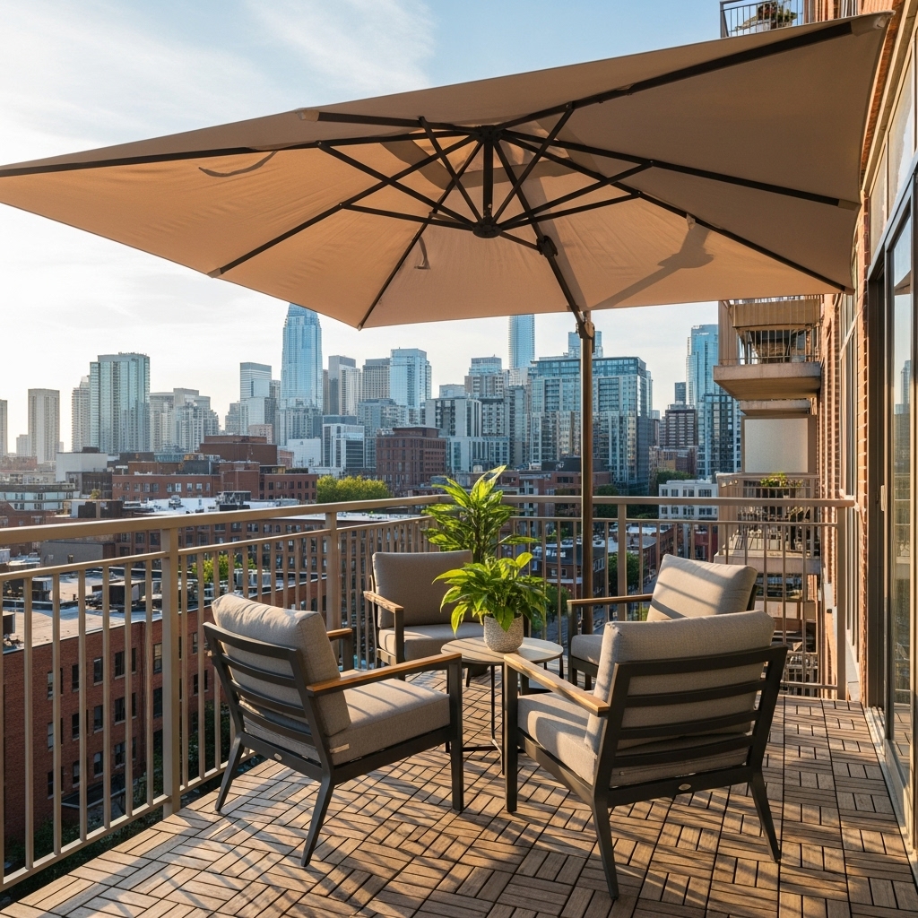 Outdoor umbrellas aren’t just for shade—they can also block unwanted views from neighboring balconies above or to the side. Offset umbrellas work particularly well for this purpose.