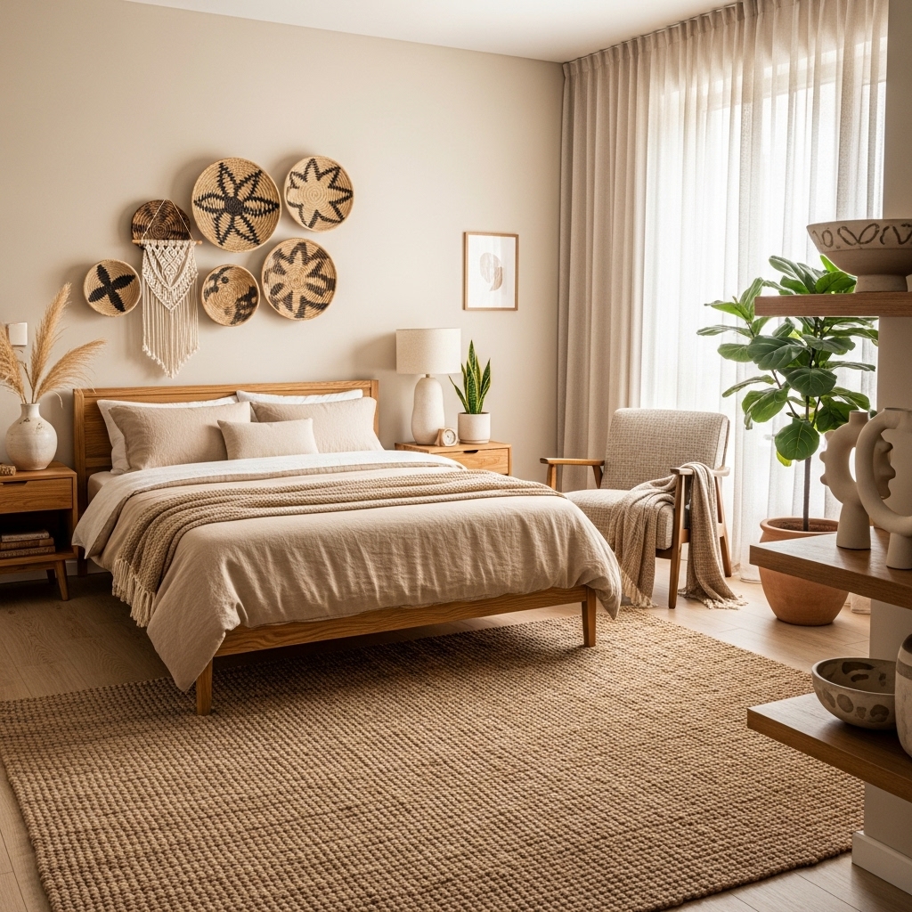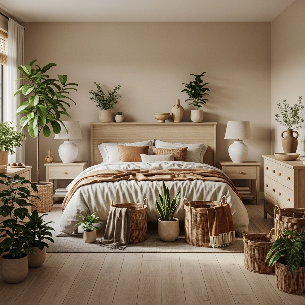 Consider adding a wooden bench at the foot of the bed, ceramic vases on nightstands, or woven baskets for storage. Even a simple potted plant can breathe life into a beige and neutral bedroom without disrupting its calm atmosphere.