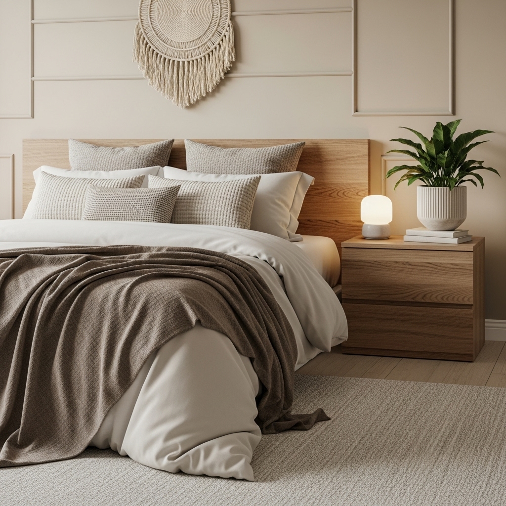 A plush area rug under the bed, a chunky knit throw, or linen curtains can instantly elevate the space. Upholstered headboards in soft fabrics add comfort while enhancing the neutral aesthetic.