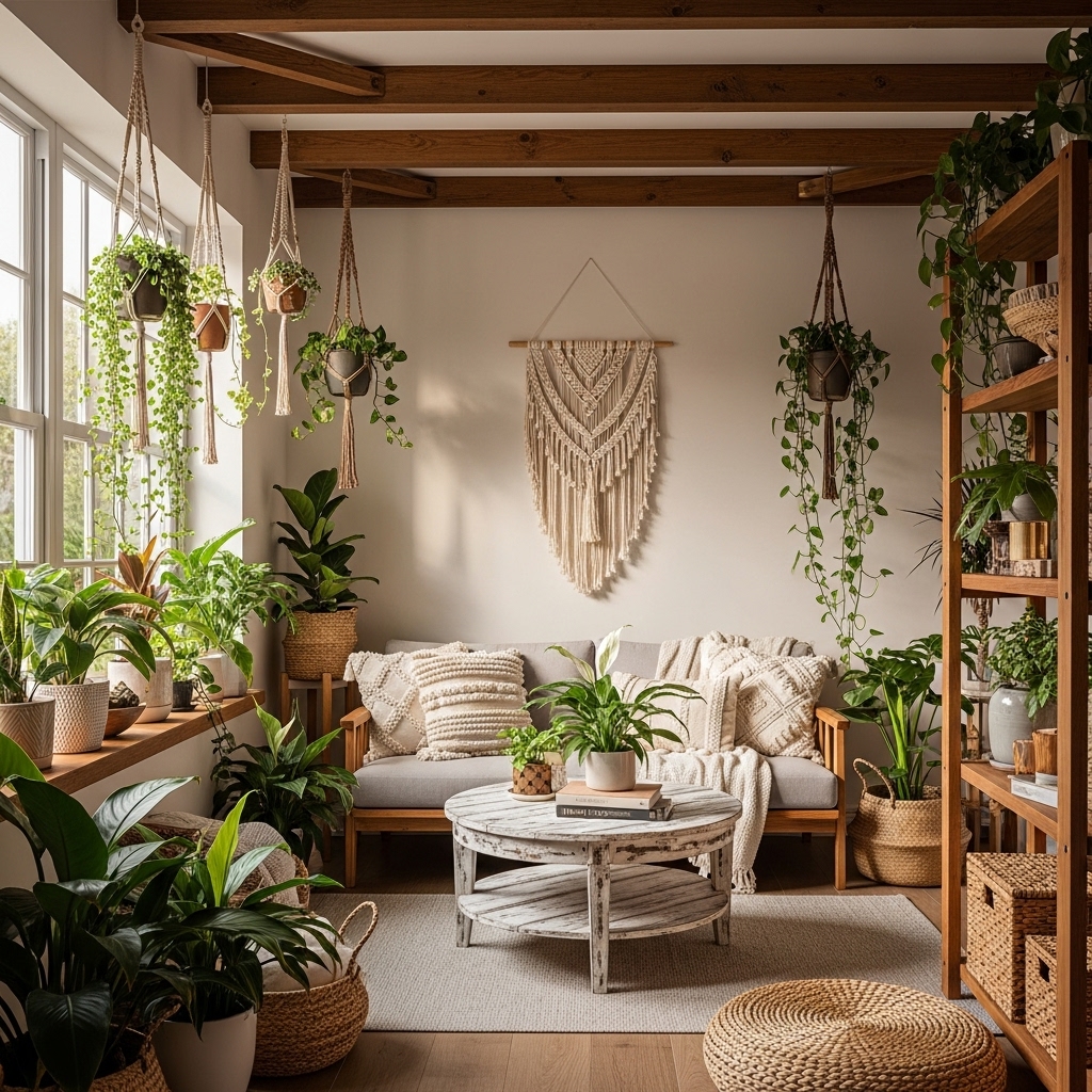 - Hanging macramé planters near windows.