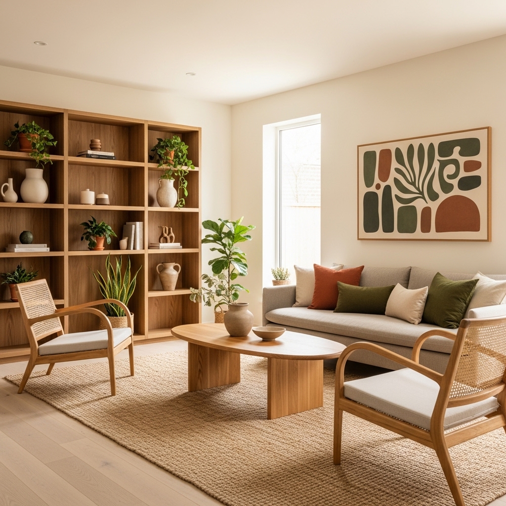 Add a large indoor plant in one corner, layer natural fiber rugs, and use wooden frames or shelves for warmth. Keep the palette neutral with earthy greens and beiges.