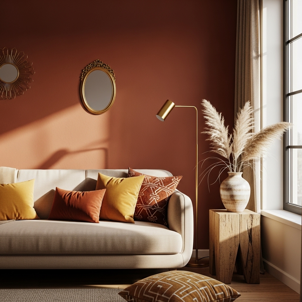 - Accent colors: Introduce warm shades like burnt orange, mustard, terracotta, and olive green through textiles, pillows, or wall art.