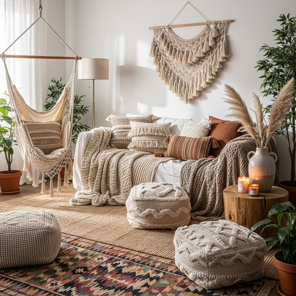 - Layered rugs and textured fabrics like linen, jute, and macramé