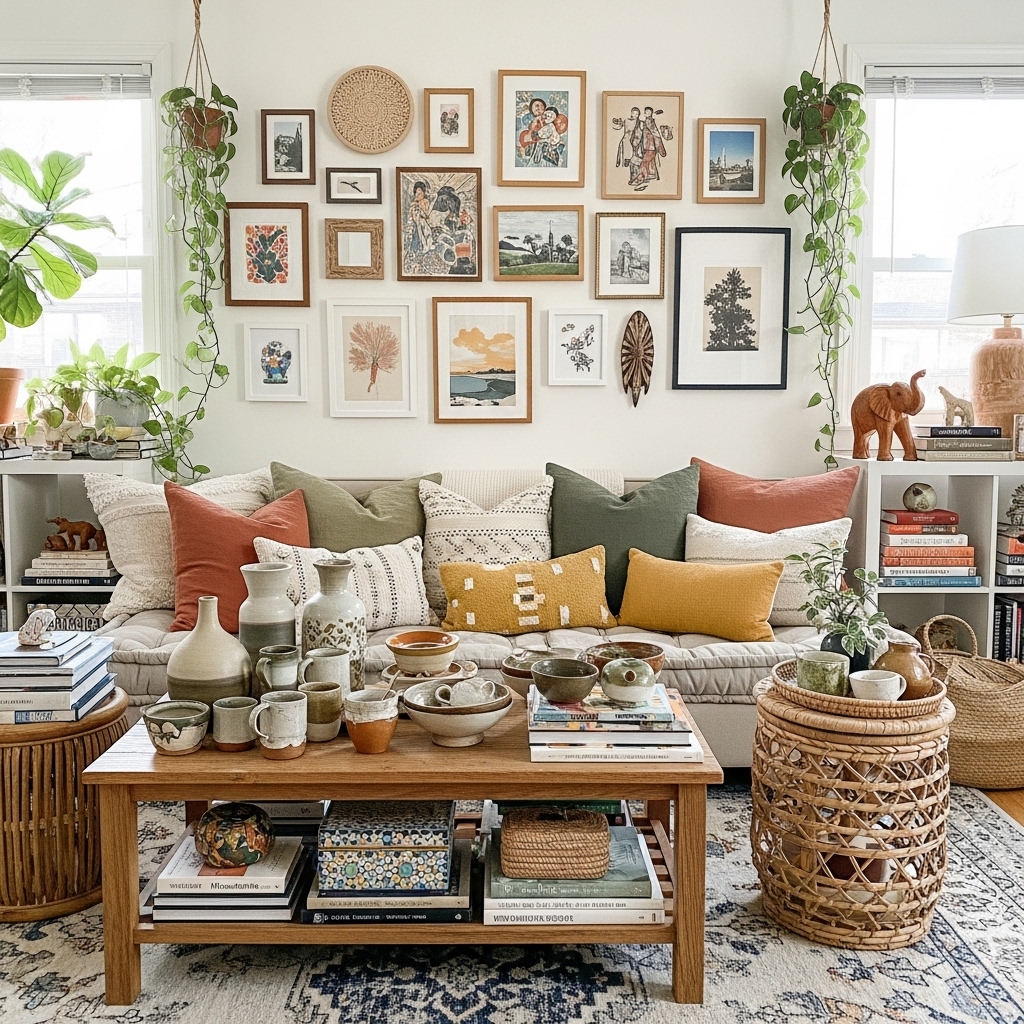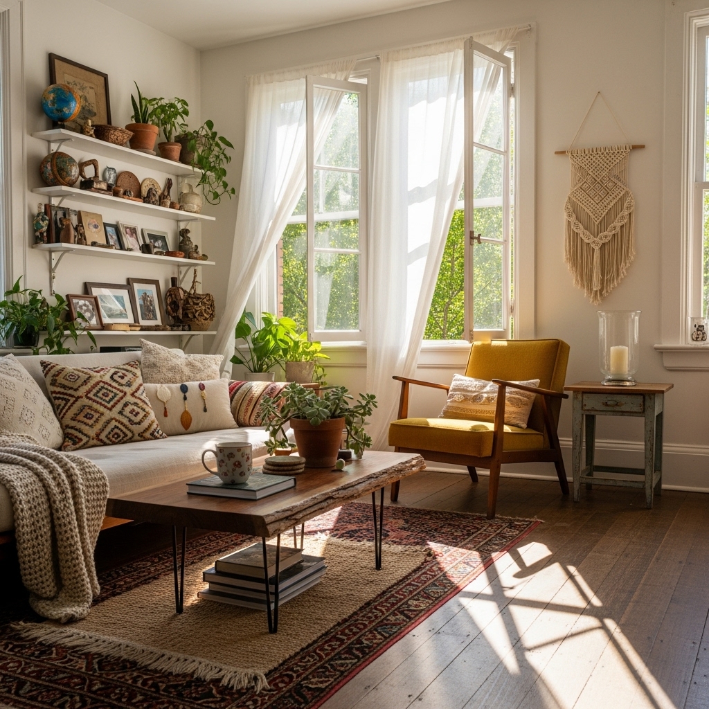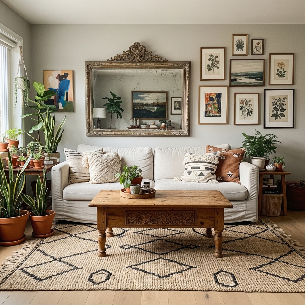 A true boho-chic living room thrives on contrast. Mixing eras—like pairing a mid-century modern sofa with a vintage coffee table—creates that curated, collected look.