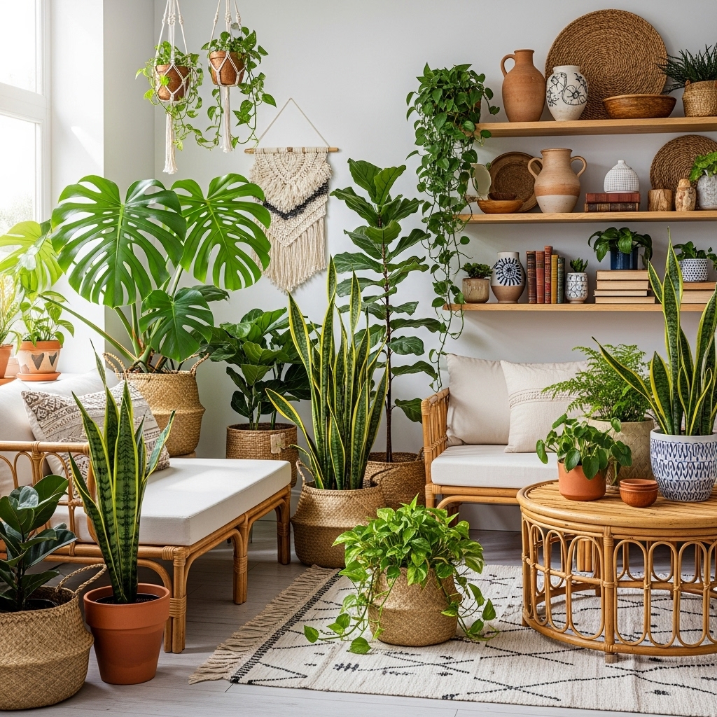 Mix different plant types—hanging, potted, or placed on stands—for visual variety. Don’t be afraid to use woven baskets or terra cotta pots for an earthy finish.