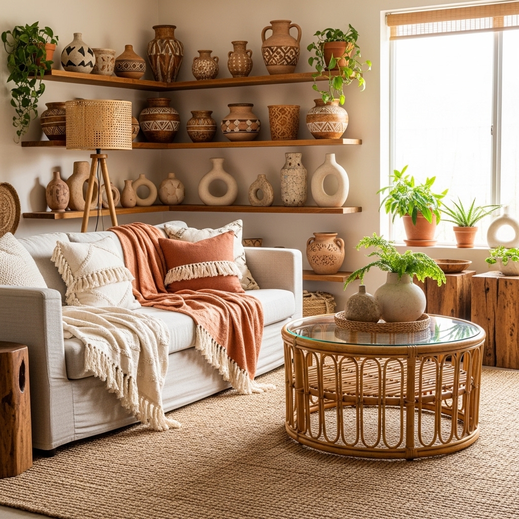 - Incorporate handcrafted or artisanal pieces like pottery, wall hangings, and woven lampshades