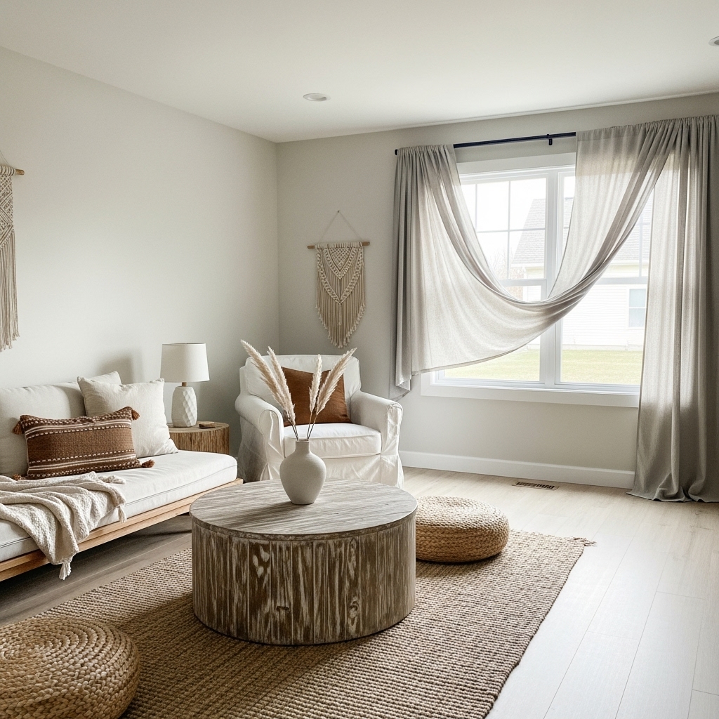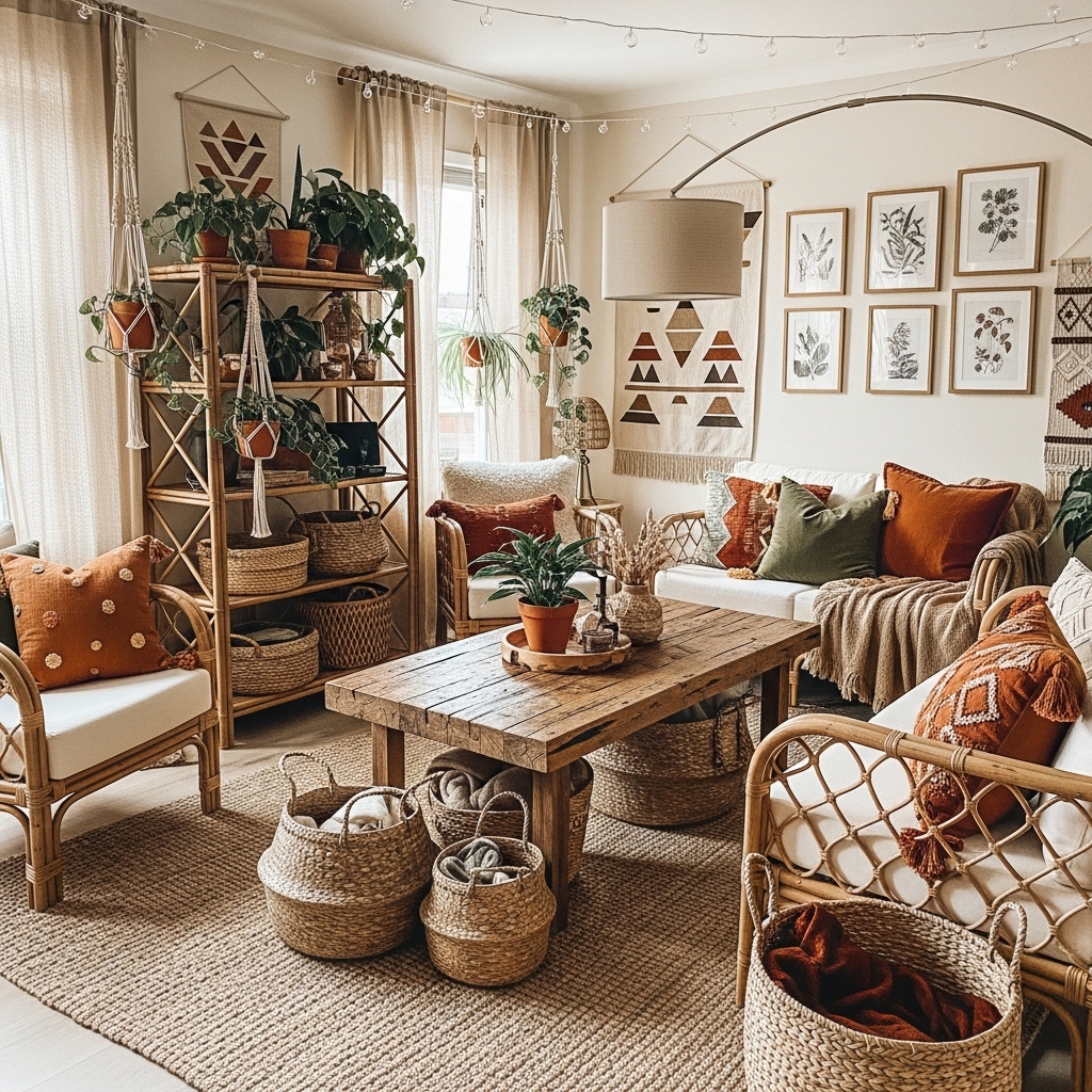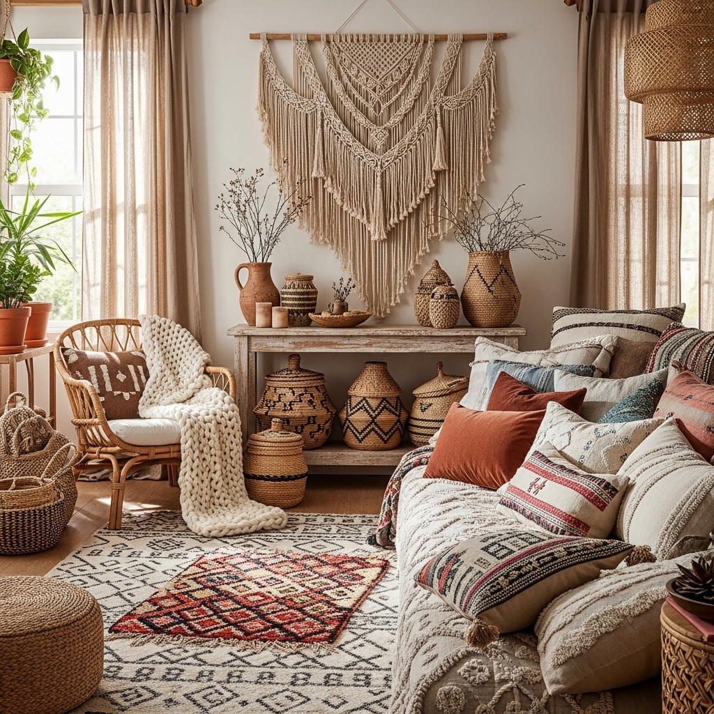 These elements instantly bring warmth and dimension into your living room. The key is mixing textures that contrast—smooth with rough, woven with soft, rustic with modern. These combinations create the relaxed and slightly undone look boho style is known for.