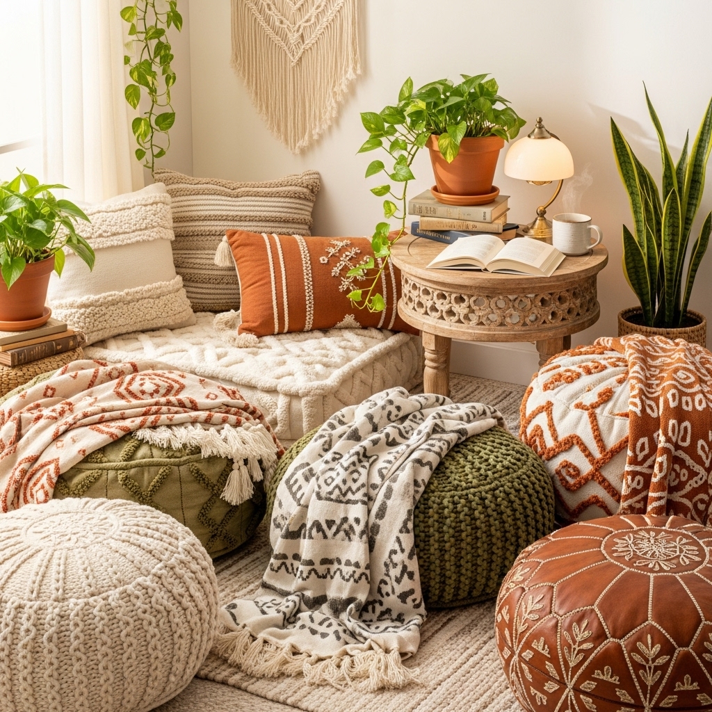 Boho decor invites relaxation, so consider carving out a special cozy nook in your living room. Use: