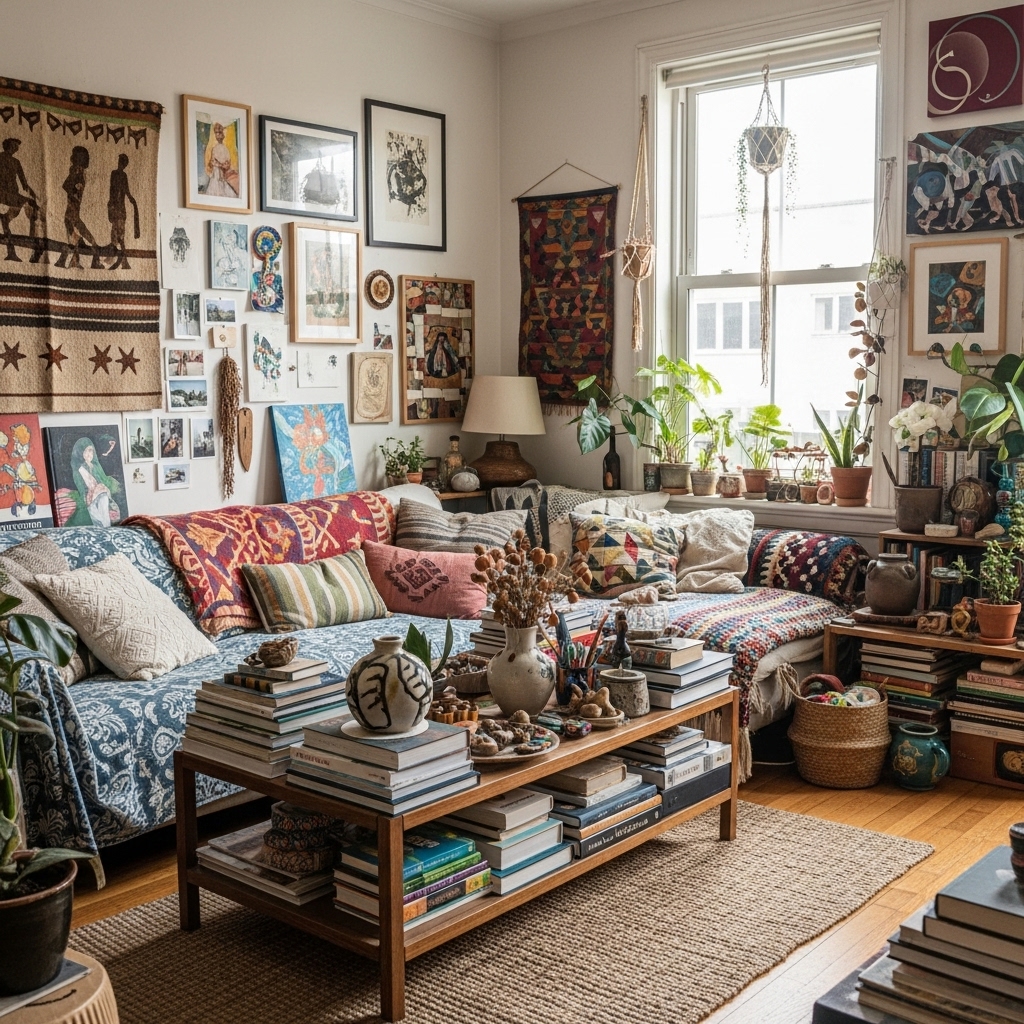 Mixing art styles—minimalist, vintage, global, and handmade—is totally acceptable in boho spaces. The eclectic blend actually enhances the charm.