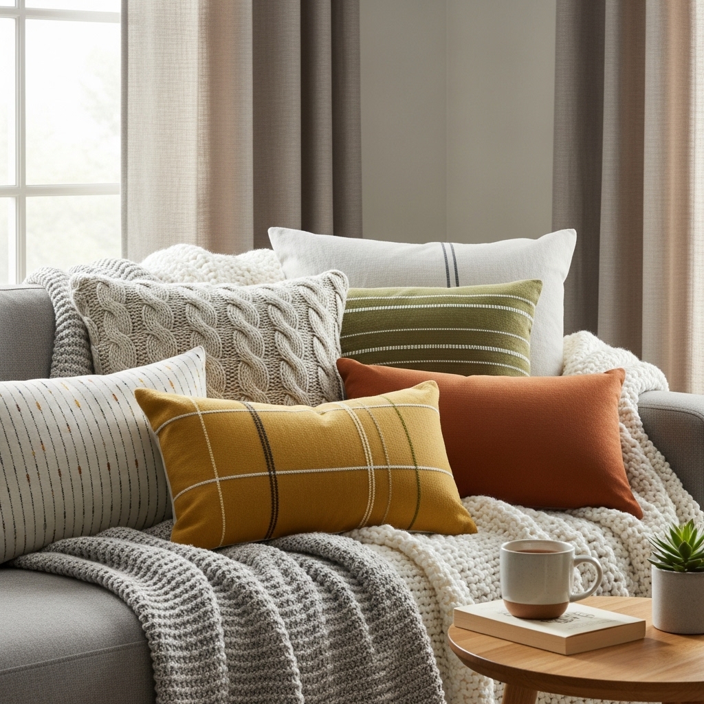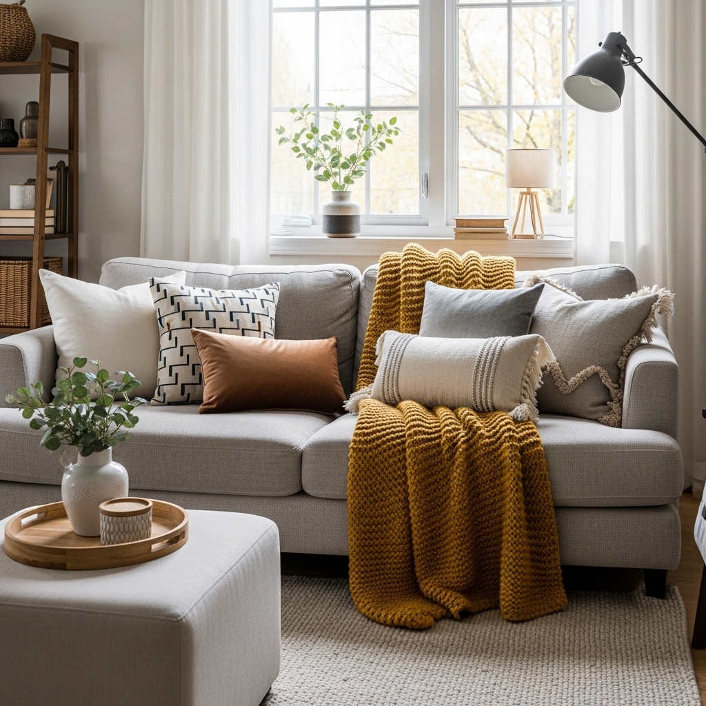 Textiles are a secret weapon when working with a tight budget. Swapping out throw pillows, blankets, and curtains instantly refreshes your living room without a major investment.