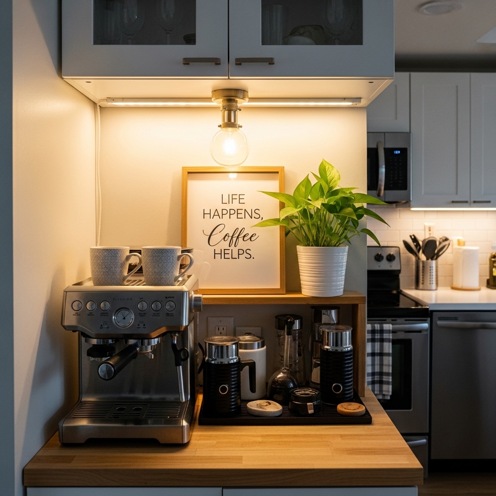 Small personalized coffee bar with framed quote, neutral mugs, soft lighting, and a tiny plant.