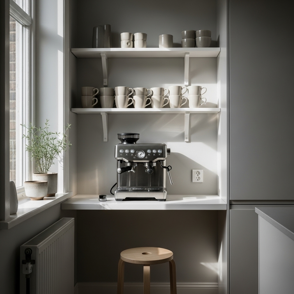Minimalist coffee bar with white shelves, a single espresso machine, neutral mugs, and soft natural lighting.