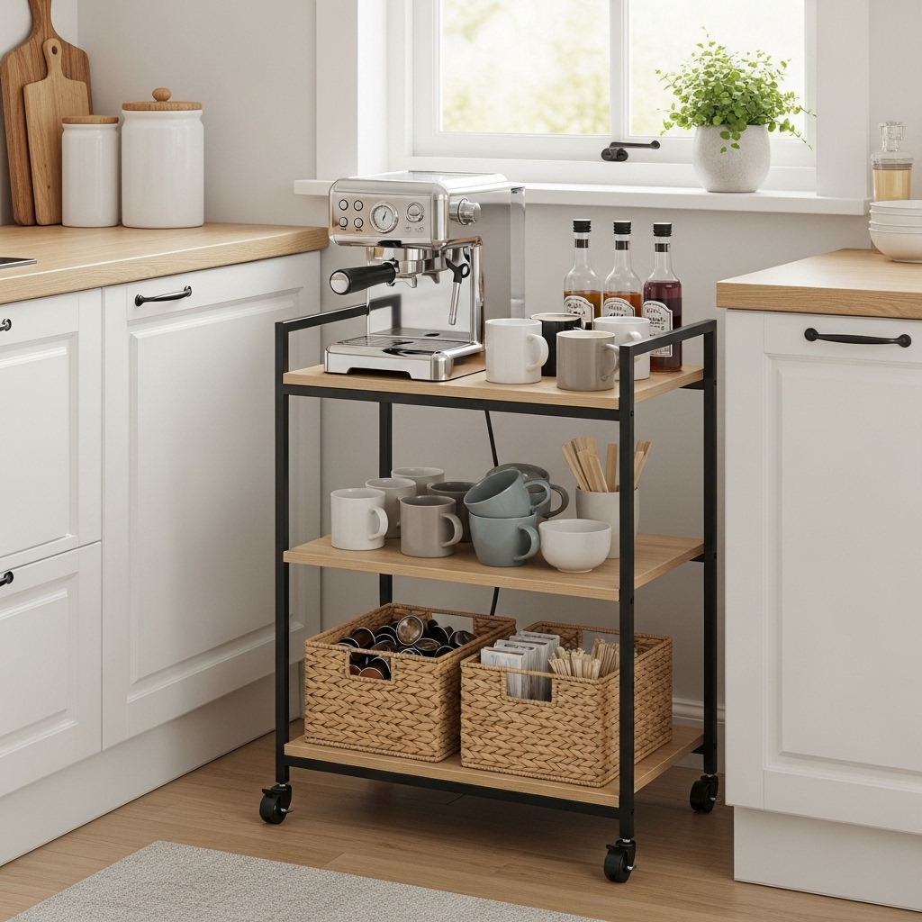 A rolling cart is one of the most practical solutions for small kitchens. It provides storage without permanent installation and can be moved when needed Coffee Bar Ideas for Small Kitchens.