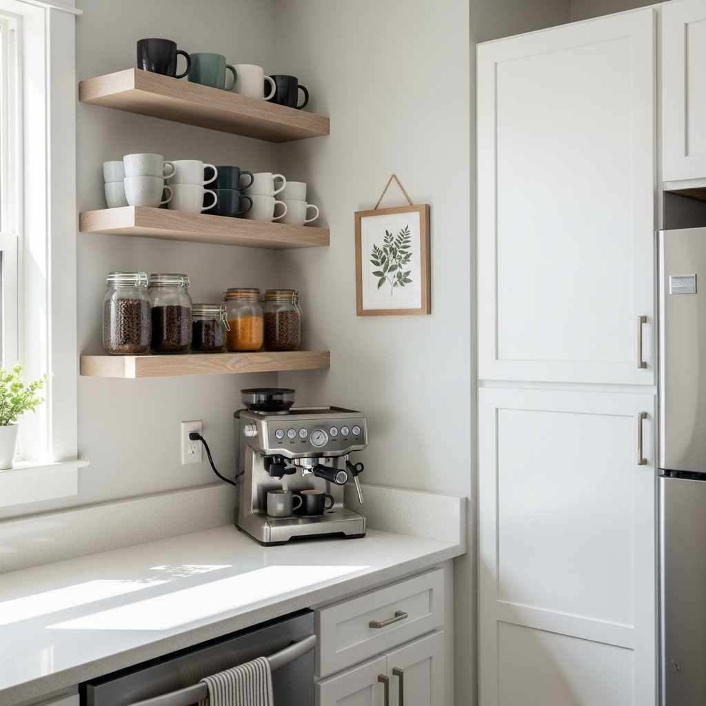 A small kitchen corner transformed into a coffee bar with a compact espresso machine, floating shelves above, and neutral-toned décor Coffee Bar Ideas for Small Kitchens.