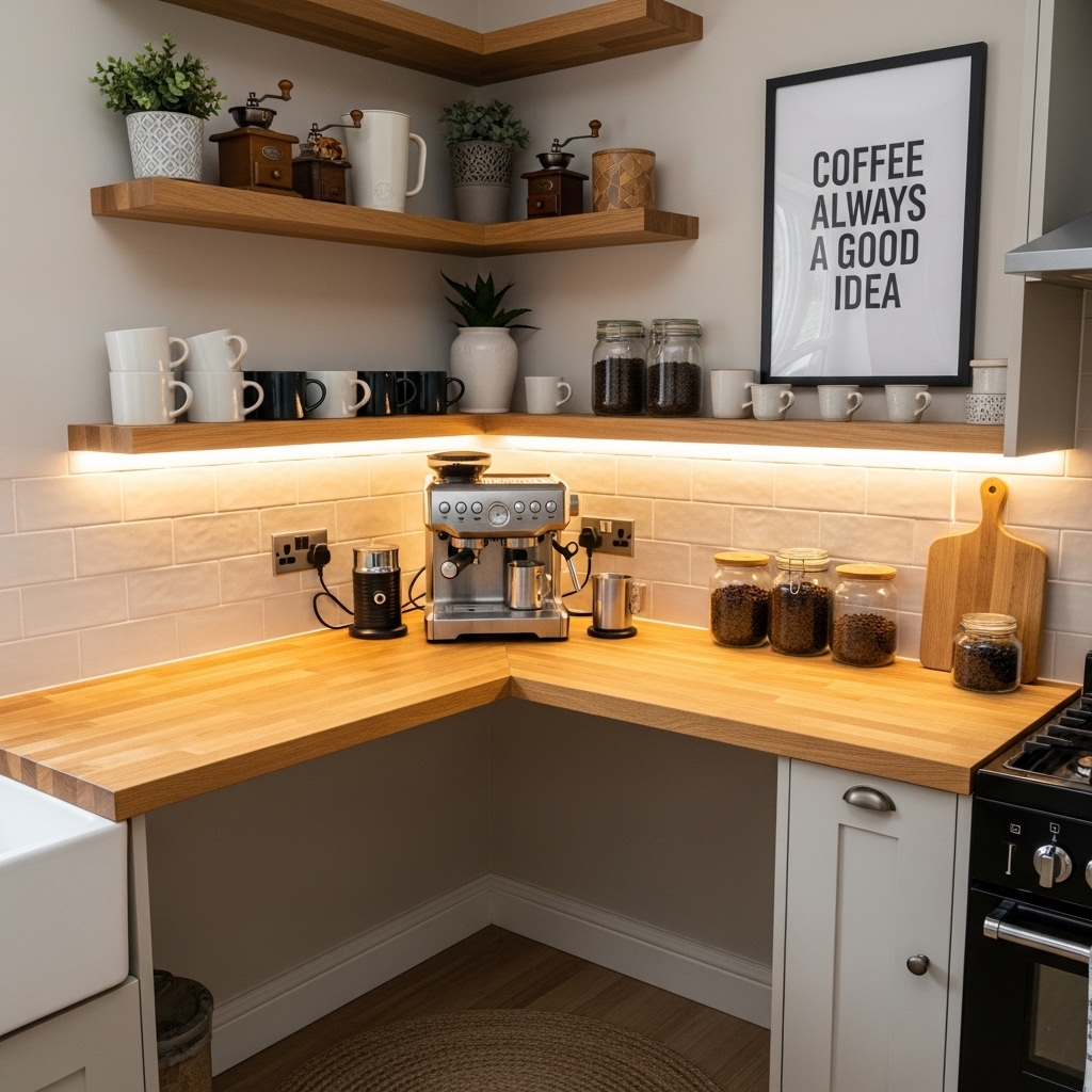 Corners often go unused in small kitchens, making them ideal for a coffee bar. A corner setup feels built-in without taking up prime real estate.