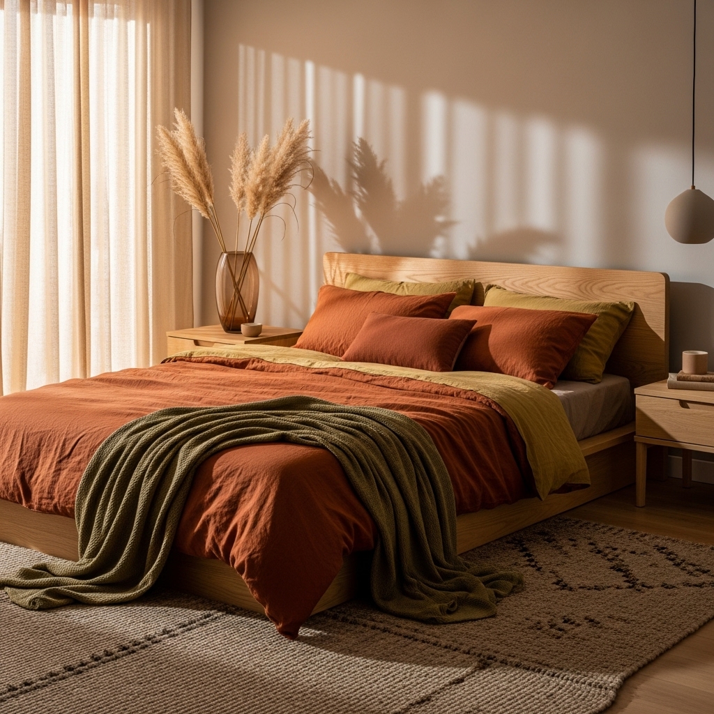 The foundation of a cozy fall bedroom lies in its color palette. Swap out bright summer hues for deeper, earthy tones: think terracotta, rust, mustard, olive, warm taupe, chocolate, and deep forest green. Layer those with neutrals like cream, oatmeal, or charcoal to balance visual weight. These tones evoke the transition of nature and create a soft, grounded backdrop.