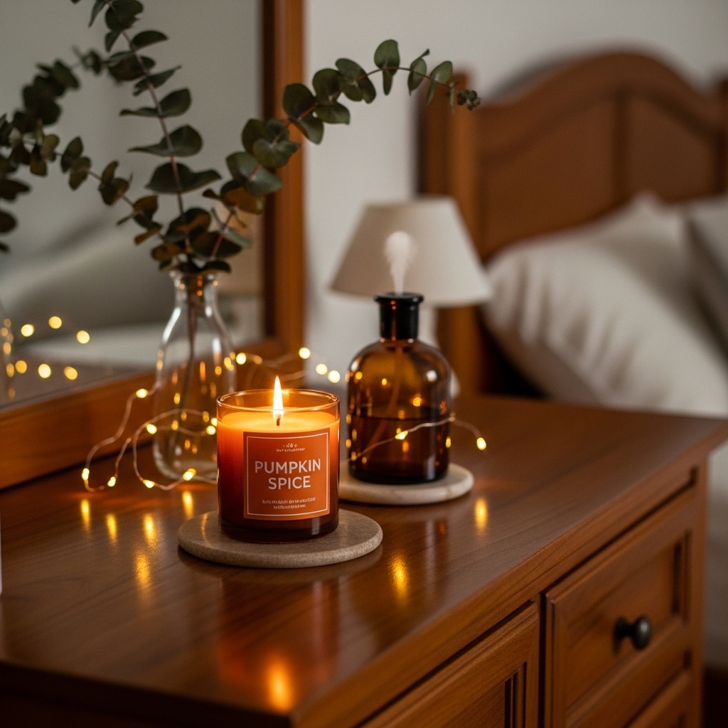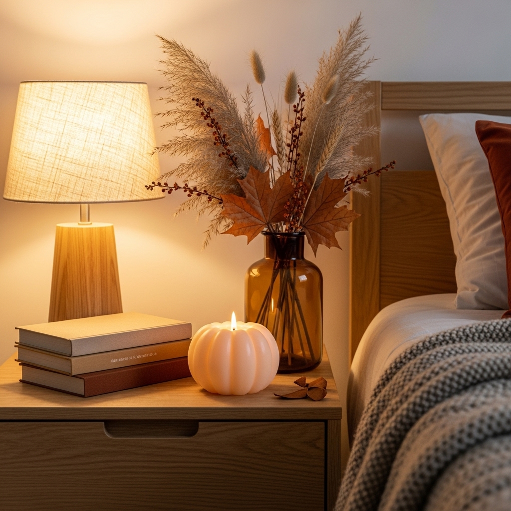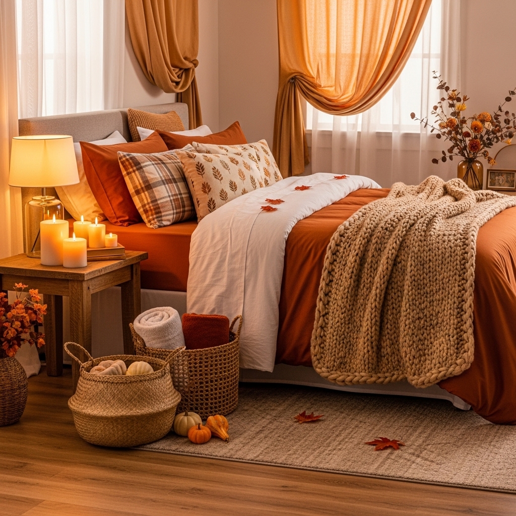 A softly scented bedroom feels layered and immersive — like stepping into a fall hug.