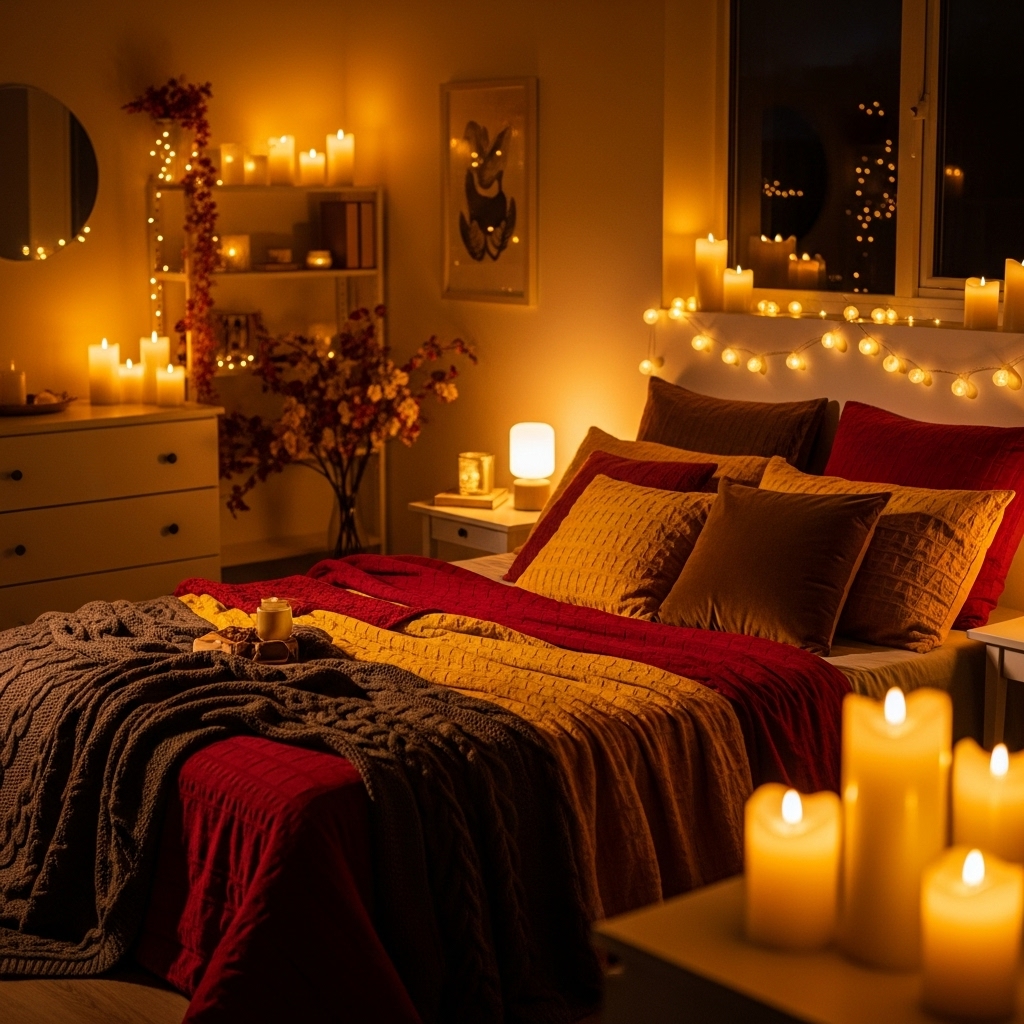 Lighting plays a critical role in making a bedroom feel cozy. During autumn, maximize ambient and accent lighting:Battery-powered flameless candles