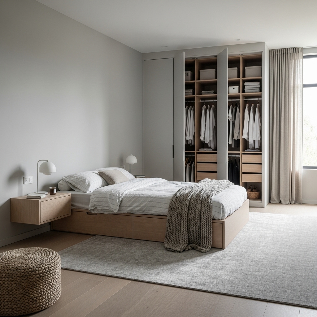 A cozy minimalist room must remain clutter-free, and proper storage is the secret to keeping everything organized. Consider multifunctional furniture such as: