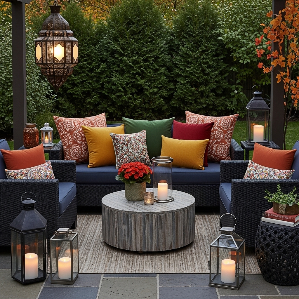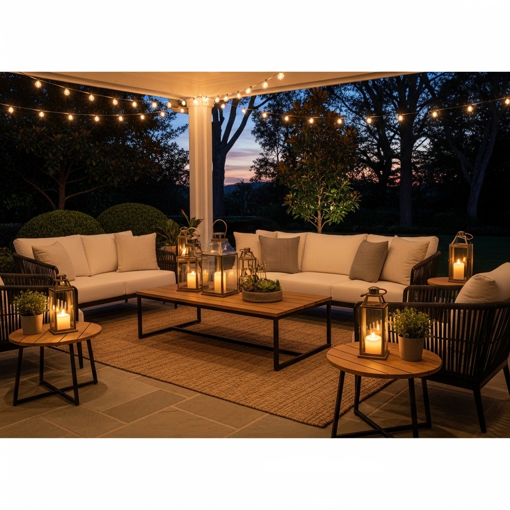 Candles in hurricane jars or LED flameless candles are perfect for tables and corners, adding warmth without worrying about open flames. For larger spaces, consider floor lamps or outdoor chandeliers specifically designed to withstand the elements Cozy Outdoor Lounge Ideas for Evenings.
