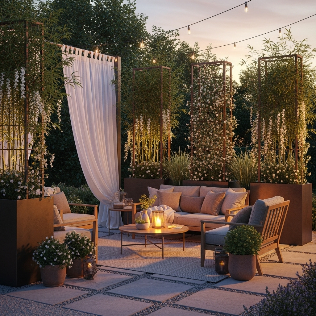 A cozy outdoor lounge should feel like a retreat, and privacy plays a big role in that. Use tall planters, trellises with climbing plants, or outdoor curtains to create a sense of enclosure. Not only does this define your lounge space, but it also blocks wind and reduces noise.