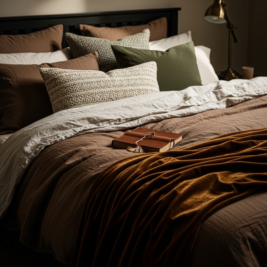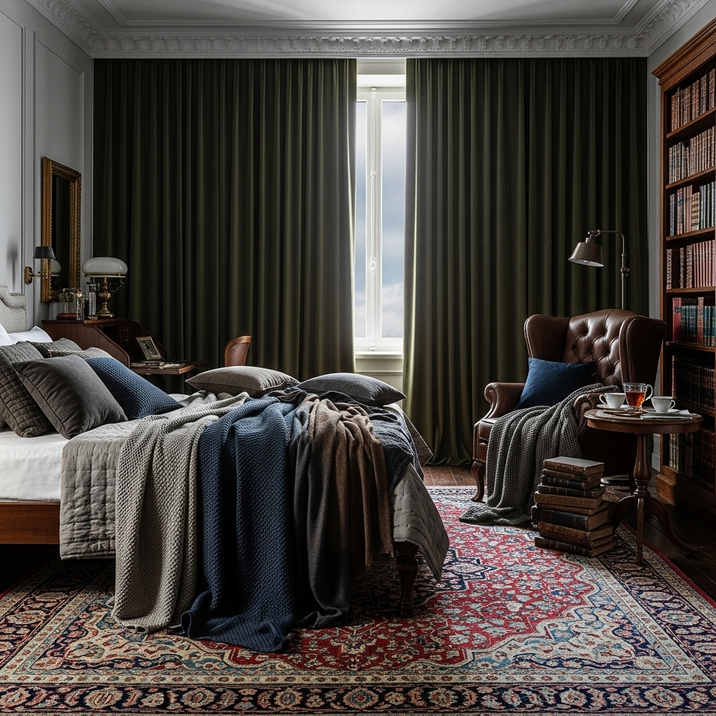 A dark academia bedroom should feel inviting, not cold. Layering is key.
