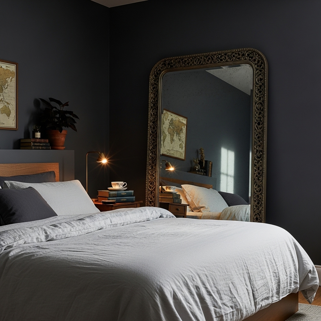 You don’t have to paint everything dark. A single accent wall behind the bed can instantly create drama, while keeping the rest of the room balanced. If painting isn’t an option, darker wallpaper with subtle patterns—like damask, botanical, or vintage stripes—works beautifully Dark Academia Bedroom Ideas for a Moody Aesthetic.