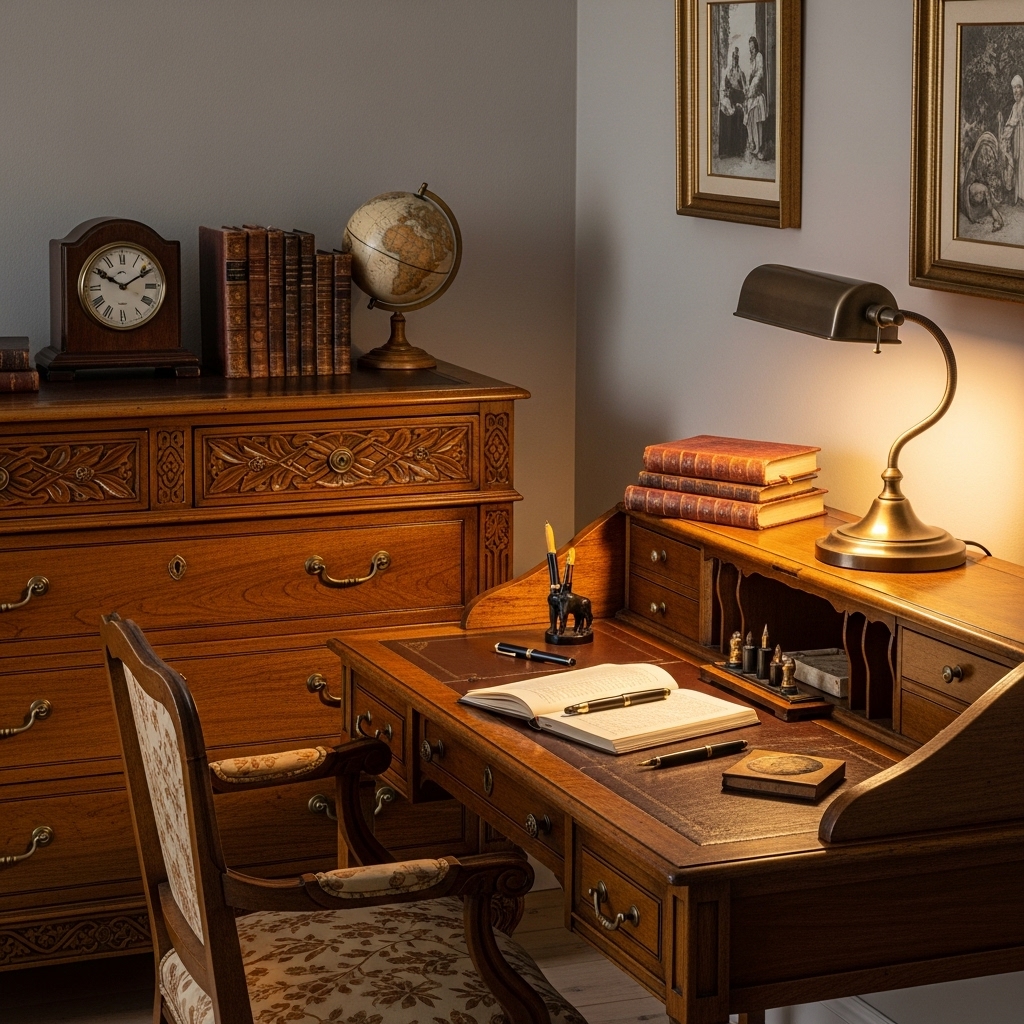 You don’t need authentic antiques—thrifted pieces, flea market finds, or modern furniture with traditional lines work just as well. Slight imperfections often add to the charm.