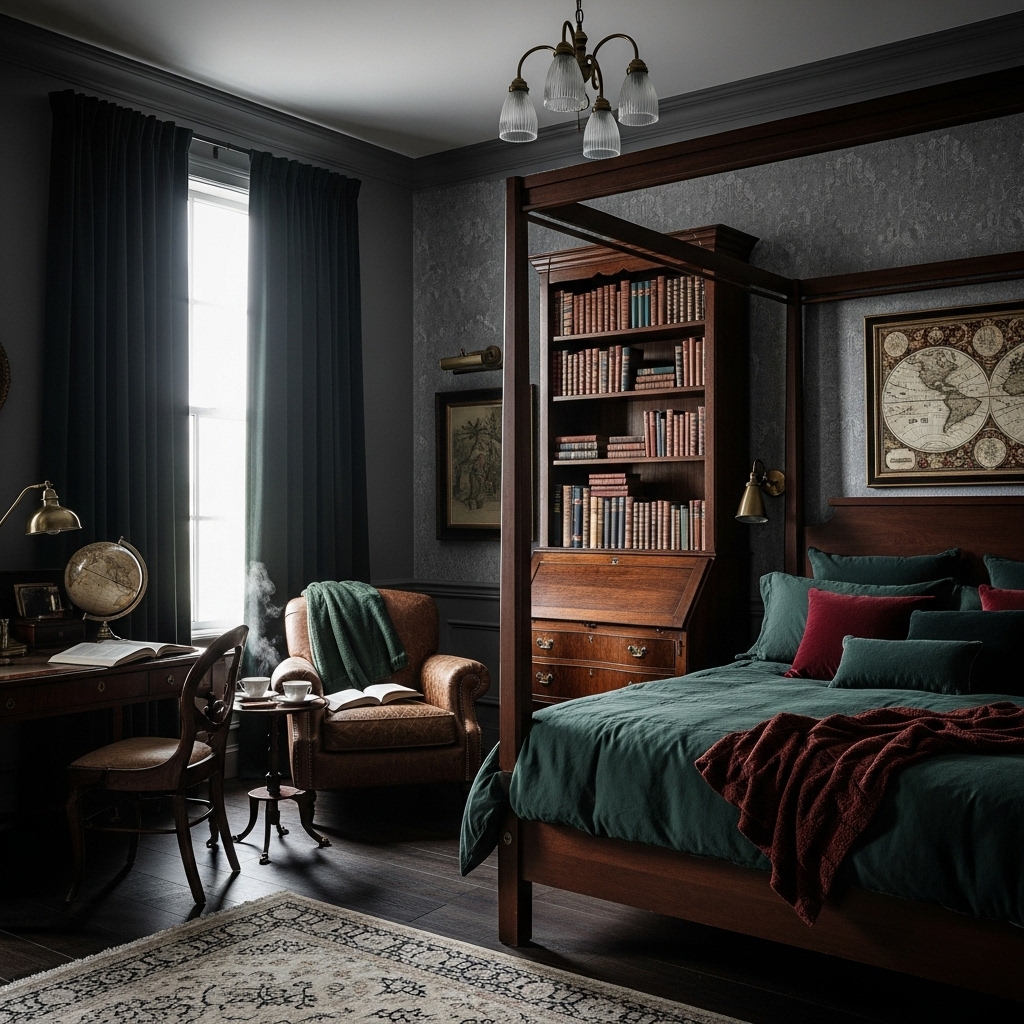 The foundation of any dark academia bedroom starts with color. Think deep, moody tones rather than stark black.