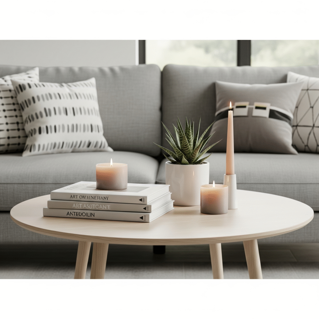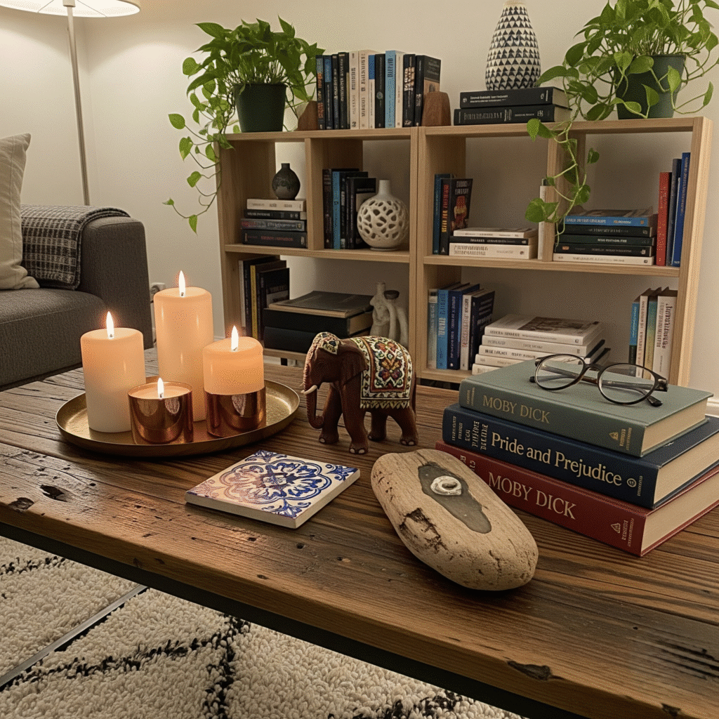 Consider displaying your favorite books on a minimalist bookshelf or styling your coffee table with candles and small trinkets.