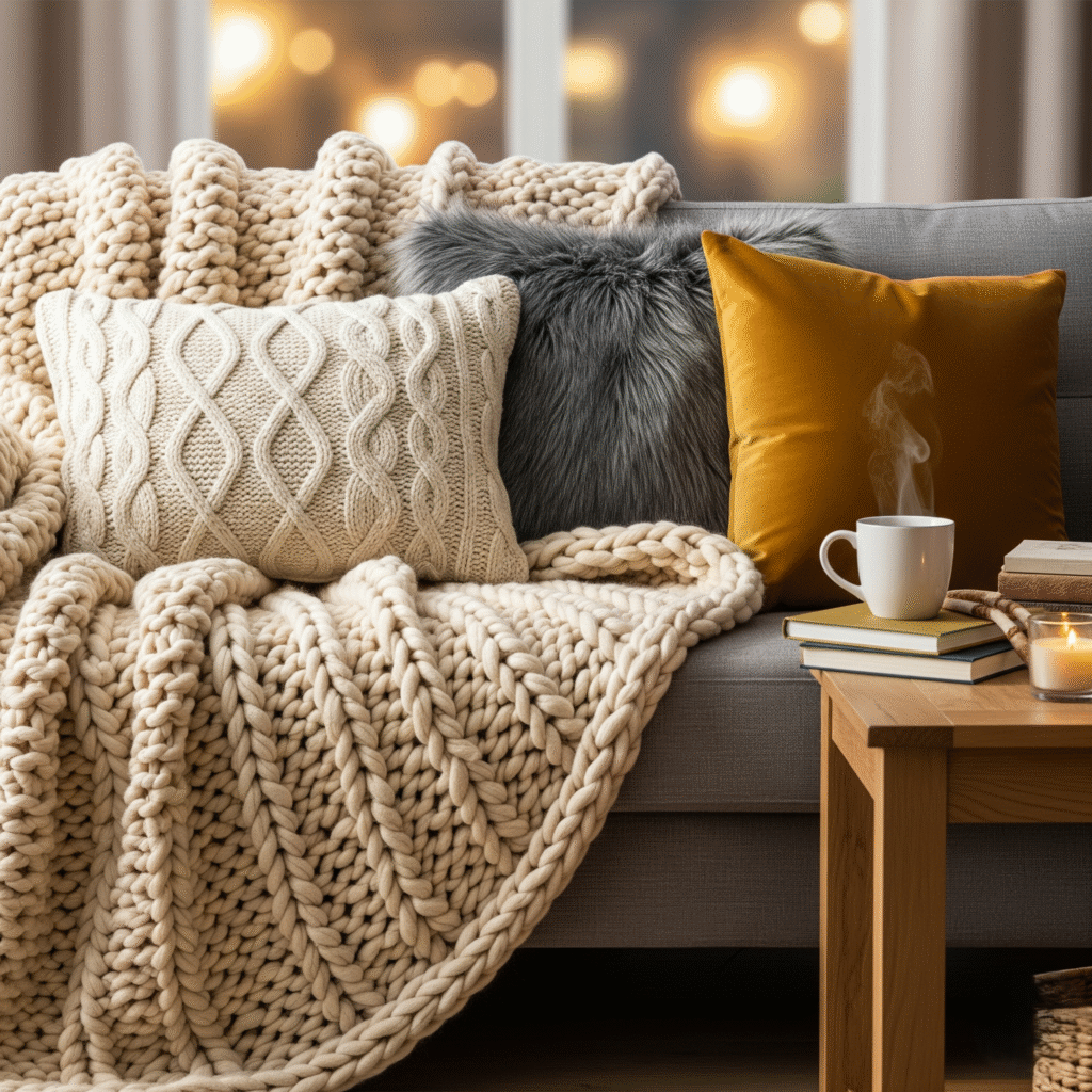 Layering soft textures instantly makes a space feel cozier. Keep a basket of throw blankets by the couch for chilly nights, and mix different pillow sizes and fabrics for a designer look.