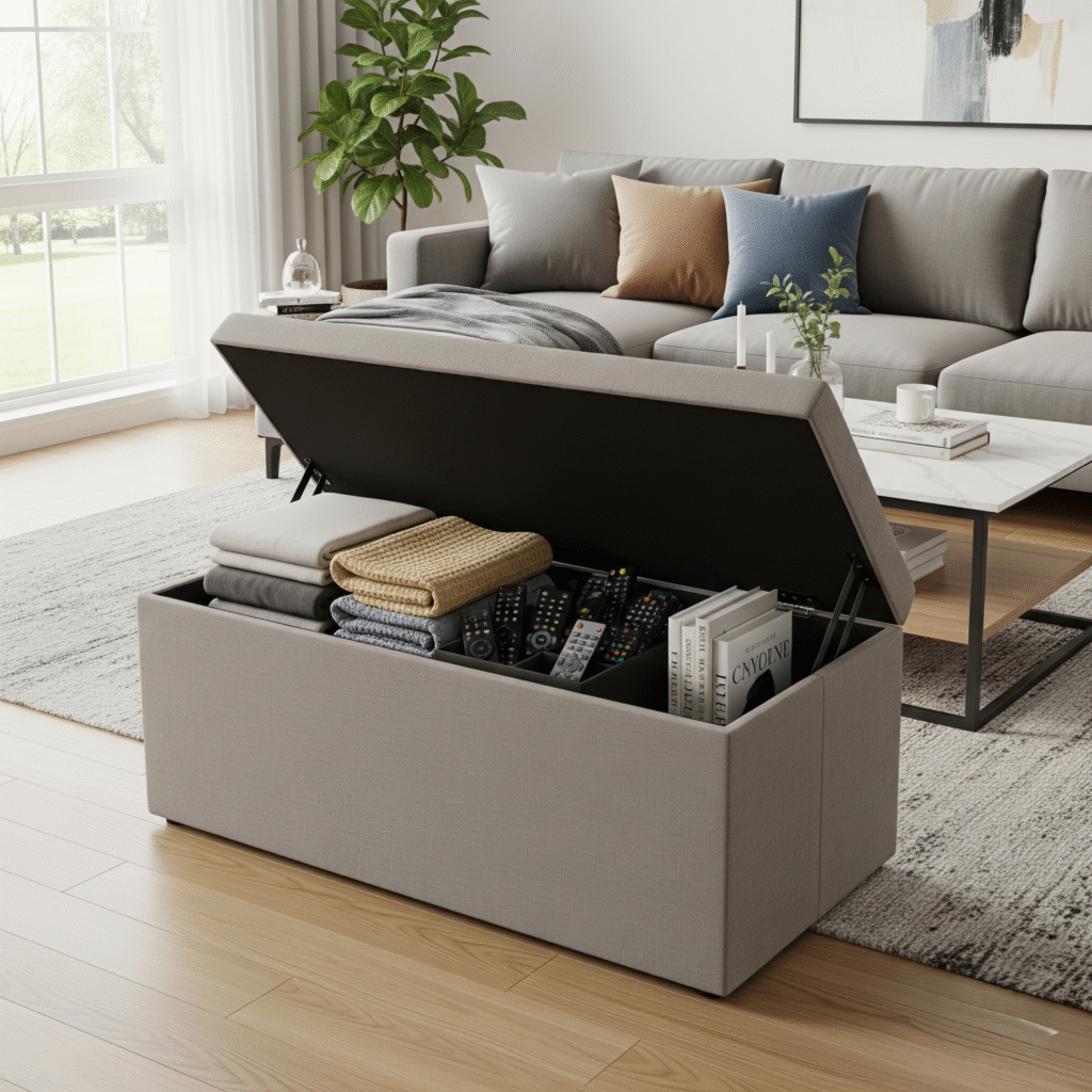 Try a storage ottoman — it doubles as extra seating and a place to hide remotes, toys, and blankets.