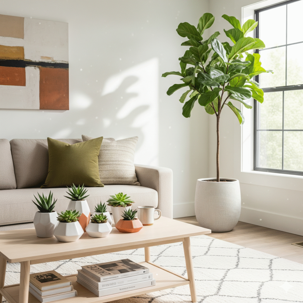 Snake plants, pothos, and fiddle leaf figs are popular low-maintenance options. You can grab chic planters from Amazon to match your style.