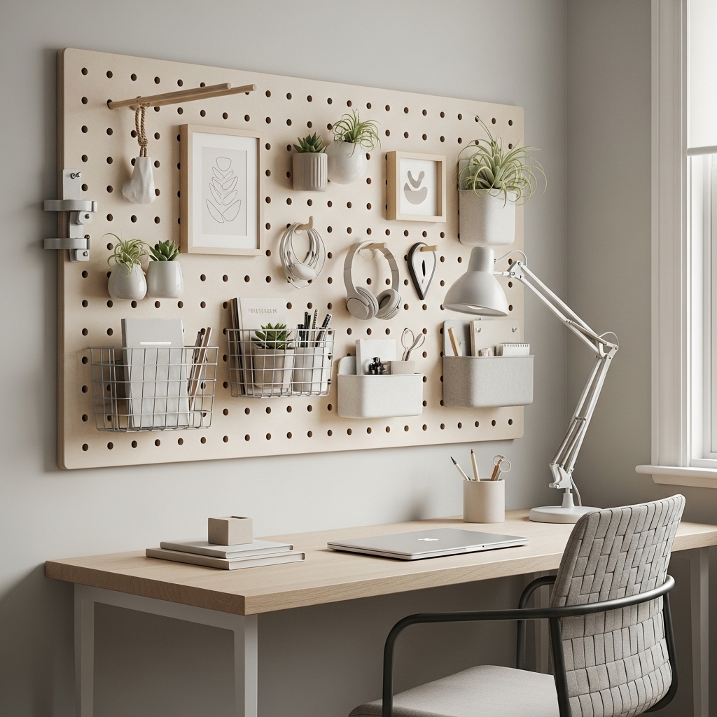 If your bedroom doubles as a workspace or reading nook, a pegboard wall is both practical and stylish.