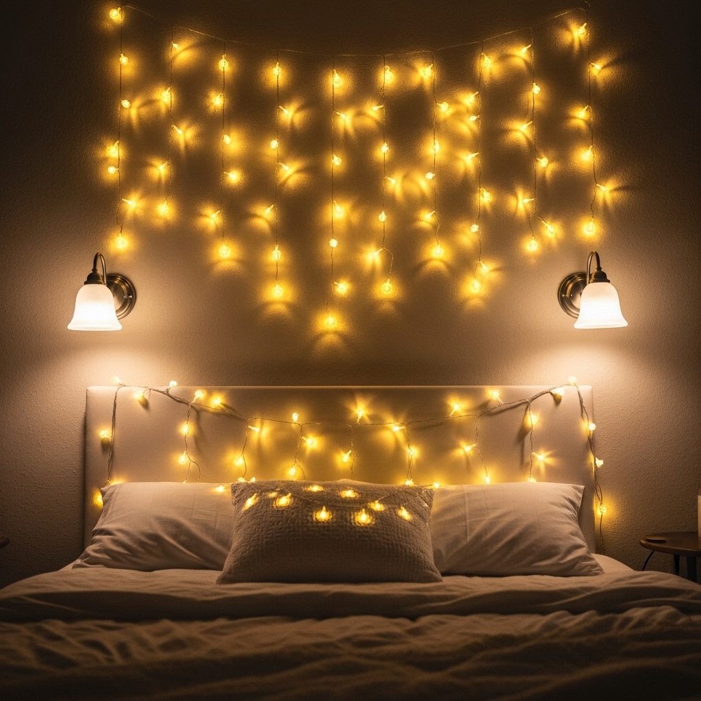 Lighting can make or break your bedroom mood. Combine functionality with beauty by adding wall-mounted lamps or string lights for a soft glow.