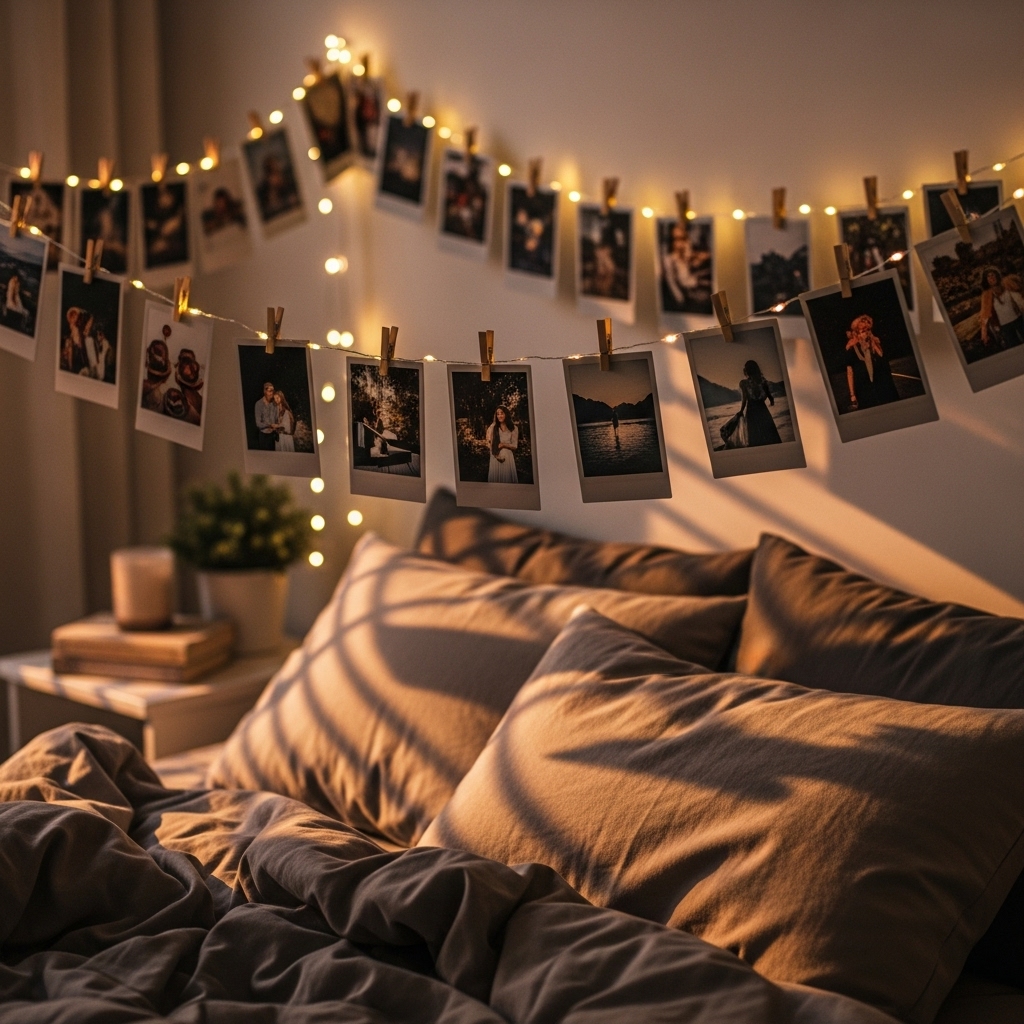 For a warm, personal touch, create a photo string display with fairy lights or twine and mini clothespins. It’s one of the easiest DIY Bedroom Wall Decor ideas that instantly makes your space feel cozier.